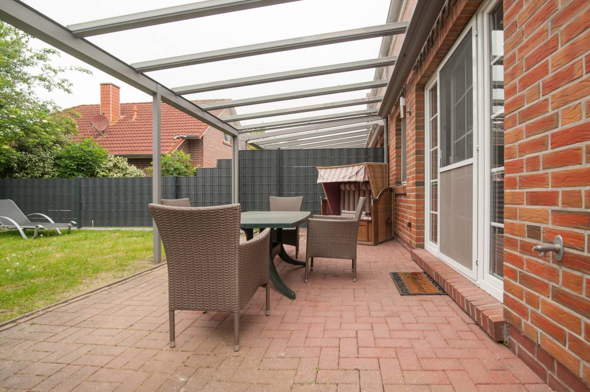 Die überdachte Terrasse ist mit Mobiliar ausgestattet zu dem auch ein Strandkorb gehört.