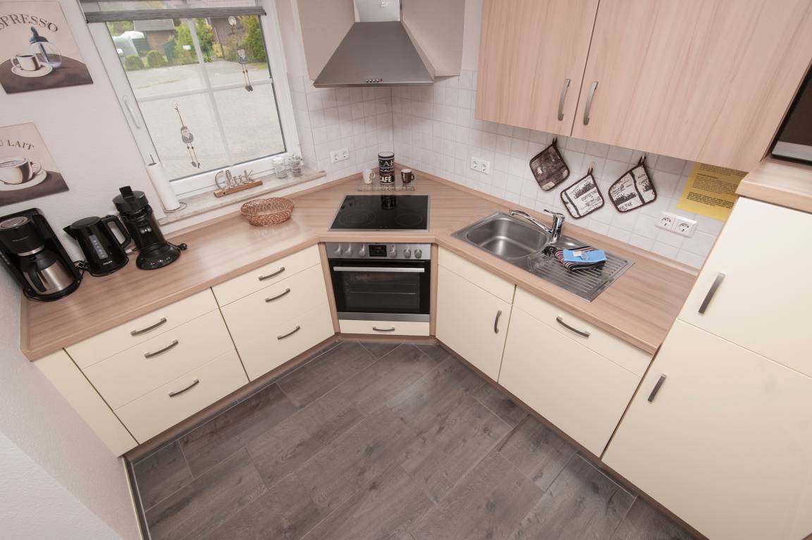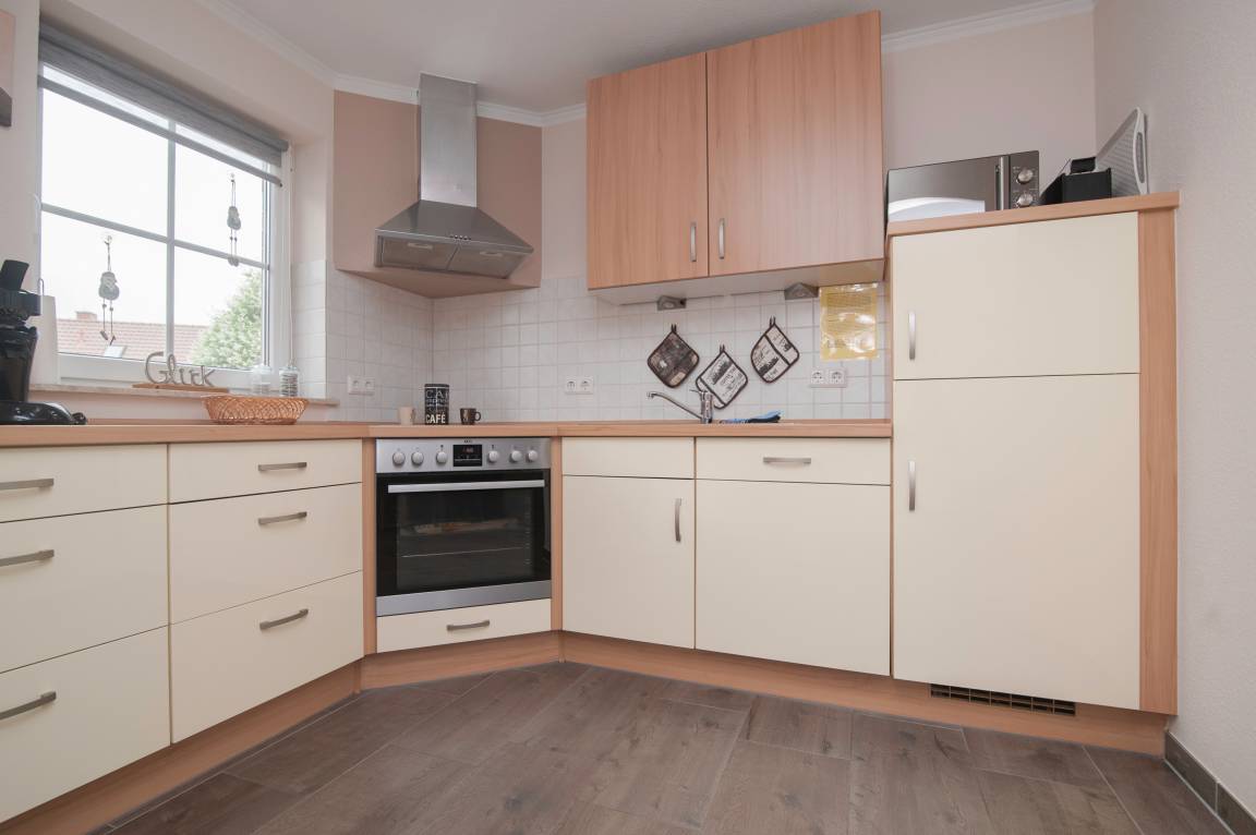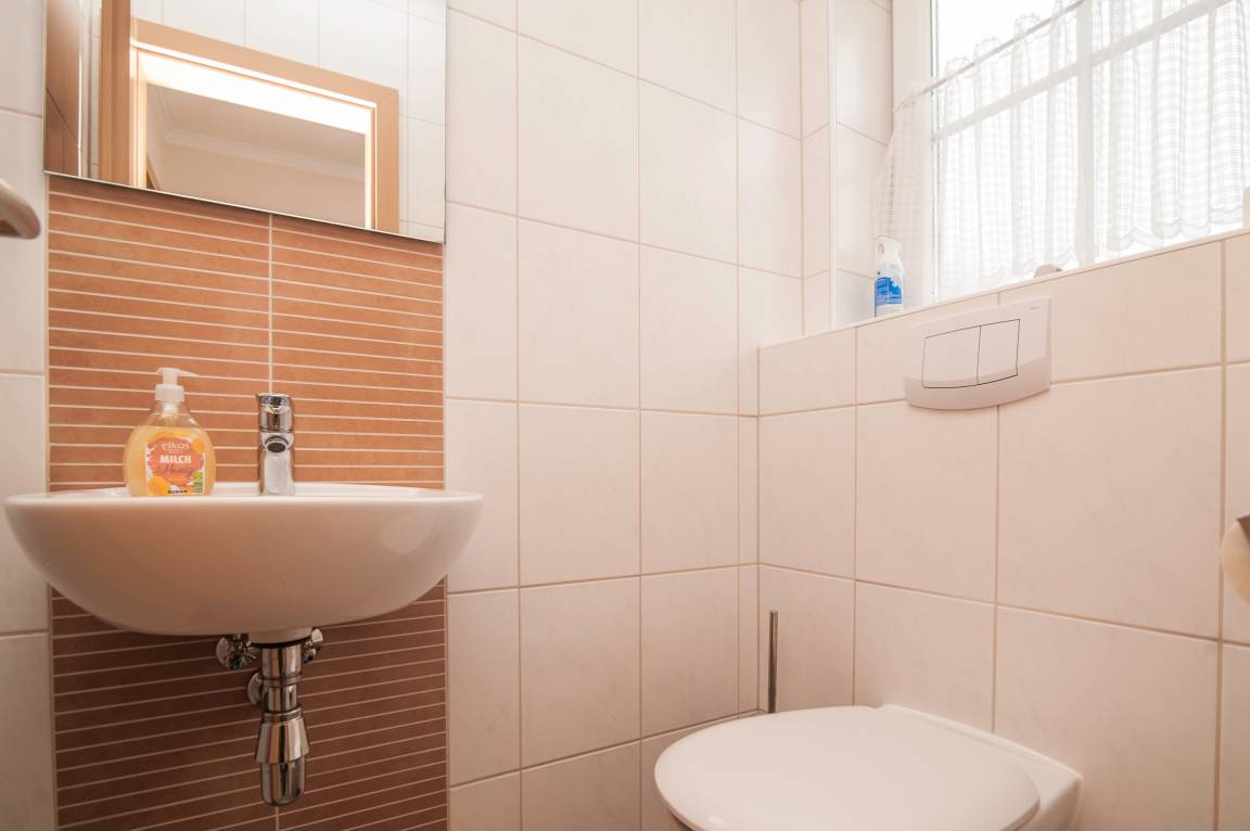 Ebenfalls im Erdgeschoß finden Sie das Gäste-WC. Eine separate, voll ausgestattete Küche Herd mit Cerankochfeld, Mikrowelle, Dunstabzugshaube, Geschirrspüler, Kühlschrank, separater Gefrierschrank (2 Fächer), Filterkaffeemaschine, Handrührgerät, Toaster, Eierkocher, Koch- und Essgeschirr u.v.m vor.