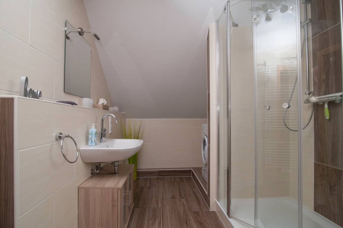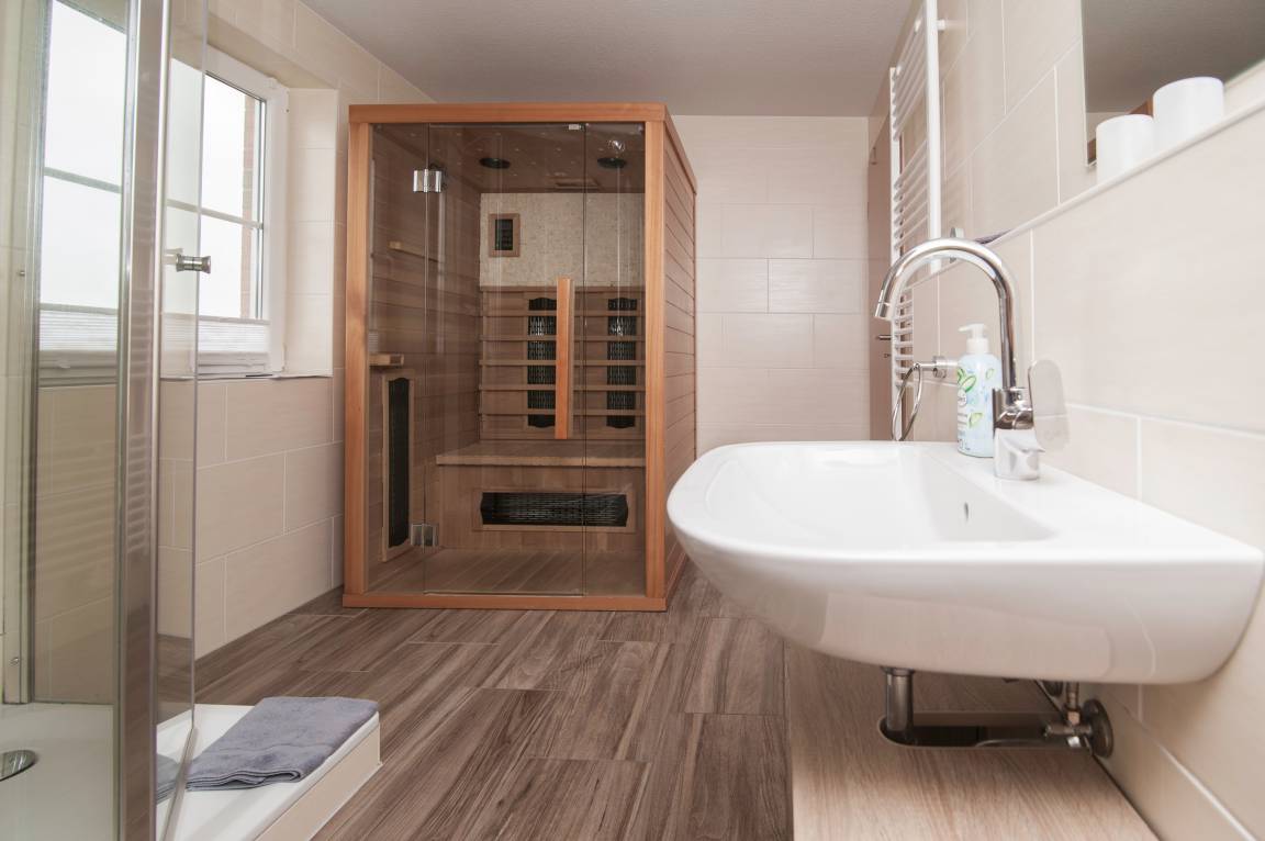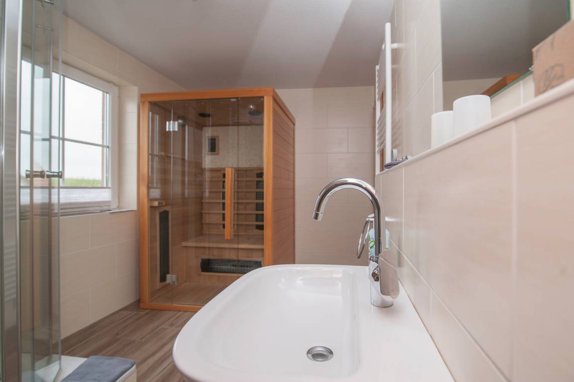 2 Badezimmer: ein Wellness-Bad mit Infrarotkabine, Dusche und Waschbecken und ein zweites Bad mit großer Dusche, Waschbecken und WC. Besonderes Extra: Eine moderne Infrarotsauna befindet sich direkt in der Wohnung und lädt zum Entspannen in privater Atmosphäre ein – der perfekte Ausklang nach einem Tag am Meer oder einer ausgedehnten Fahrradtour.