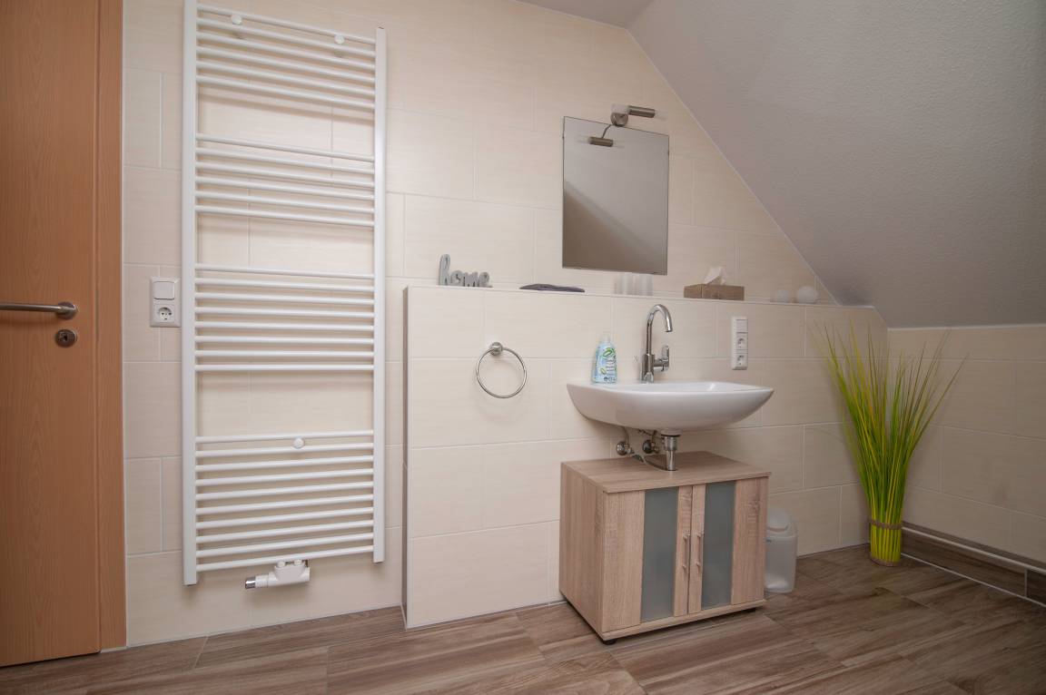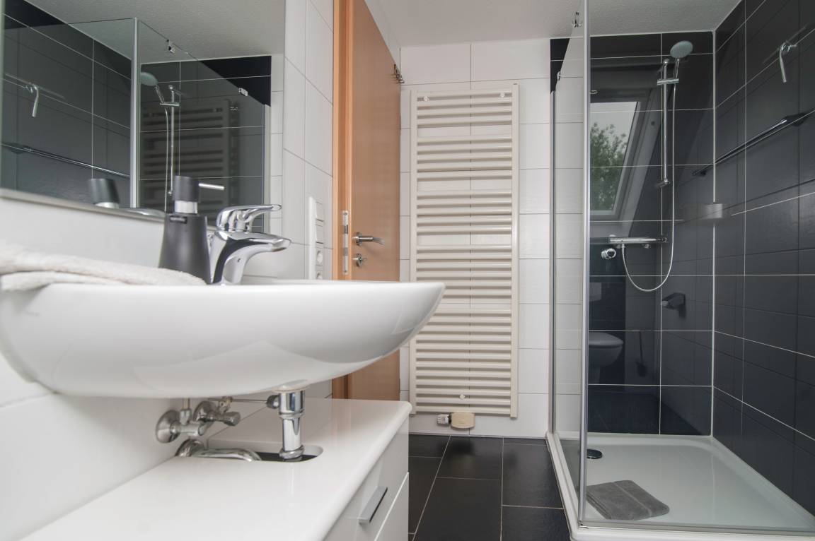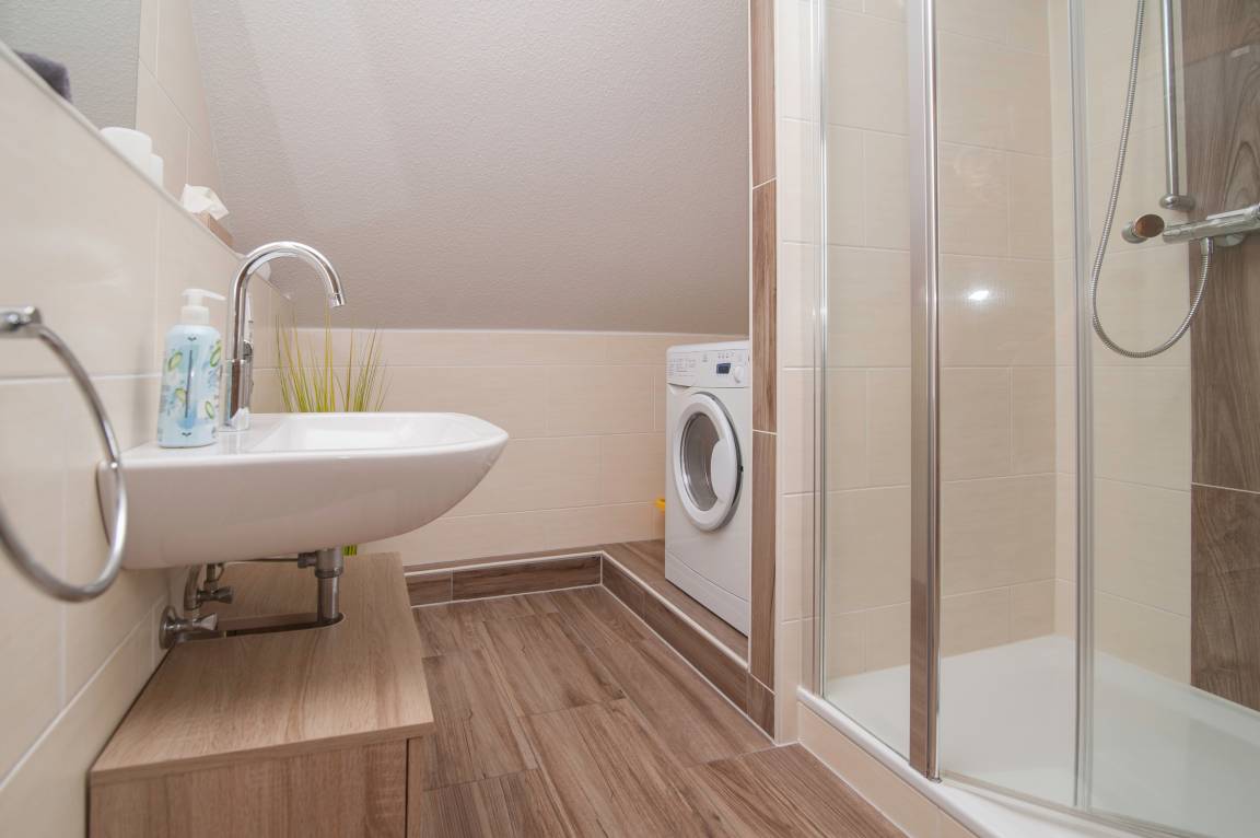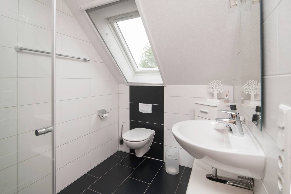 2 Badezimmer: ein Wellness-Bad mit Infrarotkabine, Dusche und Waschbecken und ein zweites Bad mit großer Dusche, Waschbecken und WC. Besonderes Extra: Eine moderne Infrarotsauna befindet sich direkt in der Wohnung und lädt zum Entspannen in privater Atmosphäre ein – der perfekte Ausklang nach einem Tag am Meer oder einer ausgedehnten Fahrradtour.