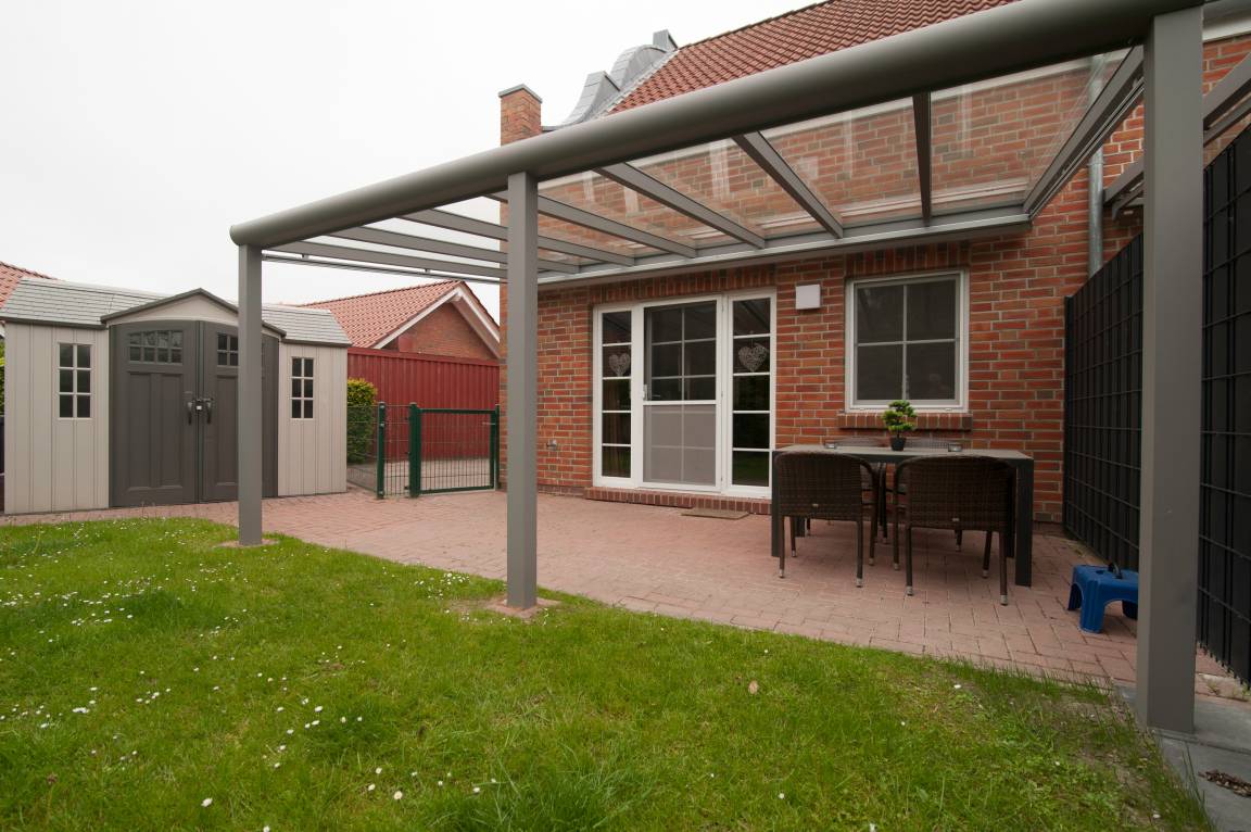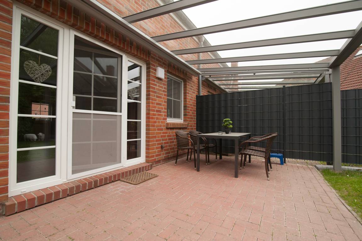 Die Terrasse ist mit einer Terrassenüberdachung und Gartenmöbeln sehr gut ausgestattet, ein kleiner Garten steht zur Verfügung.