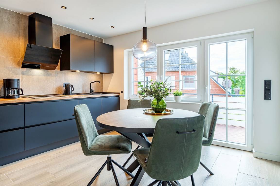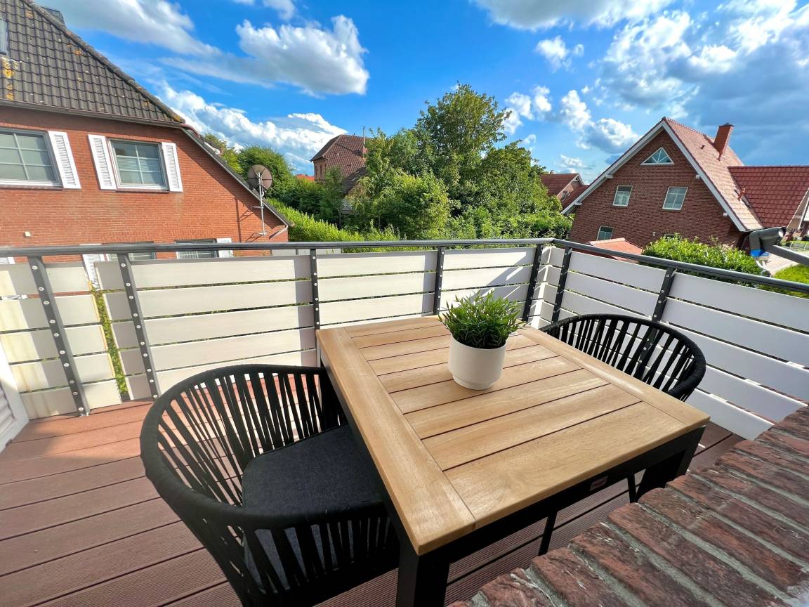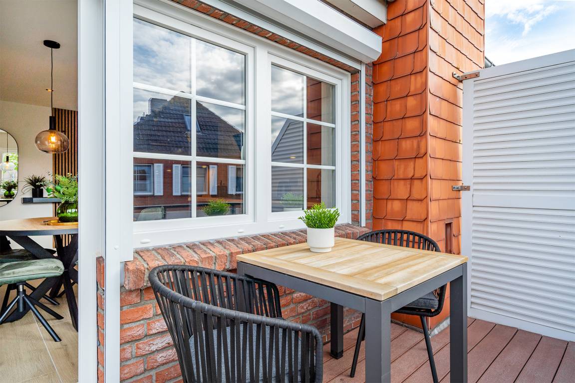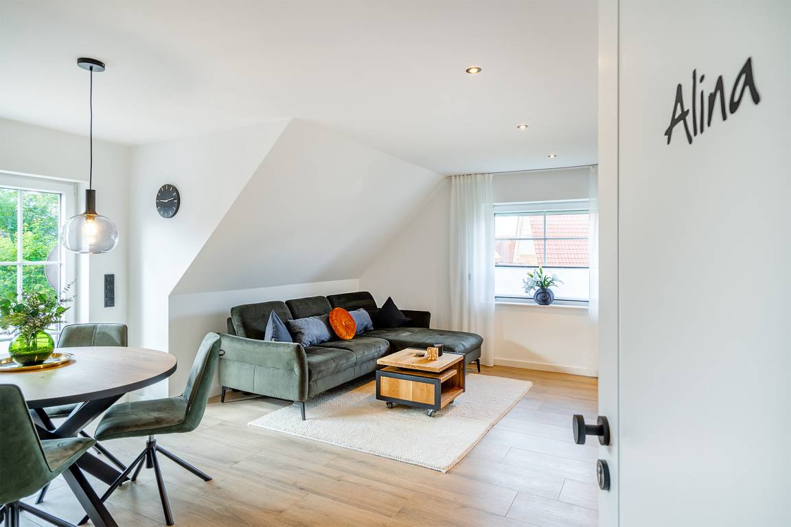 Unsere Ferienwohnung "Alina" liegt in einem beliebten und traditionellen Ferienhausgebiet von Greetsiel und erstrahlt nach einer aufwändigen und umfangreichen Renovierung in neuem Glanz. Die moderne und äußerst hochwertige Einrichtung im lichtdurchfluteten und großzügigen Wohn-Ess-Bereich wird Ihnen sicher ebenso gefallen wie das Schlafzimmer mit seinem gemütlichen Boxspringbett. Neben einem geräumigen Tageslicht-Bad verfügt die Wohnung auch über einen Abstellraum. Sie liegt im Obergeschoss des Hauses mit vier Wohneinheiten und verfügt somit über einen großen Balkon, der mit Balkonmöbeln ausgestattet ist. Selbstverständlich steht Ihnen auch ein eigener Parkplatz am Haus zur Verfügung.