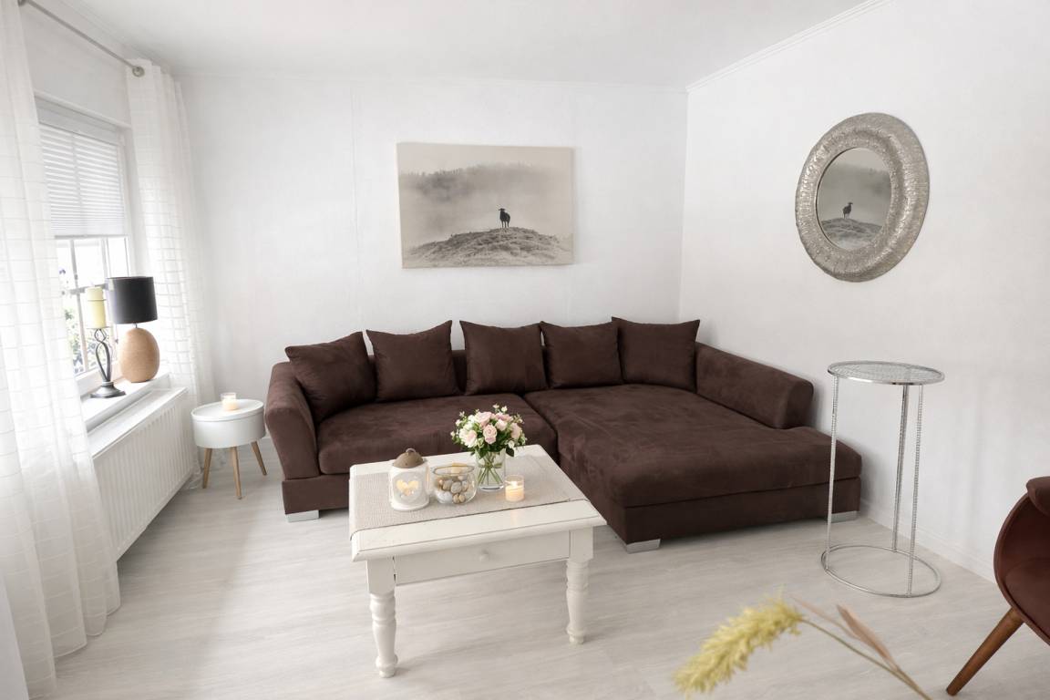 • Helles Wohnzimmer mit großer Eckcouch und Smart-TV
