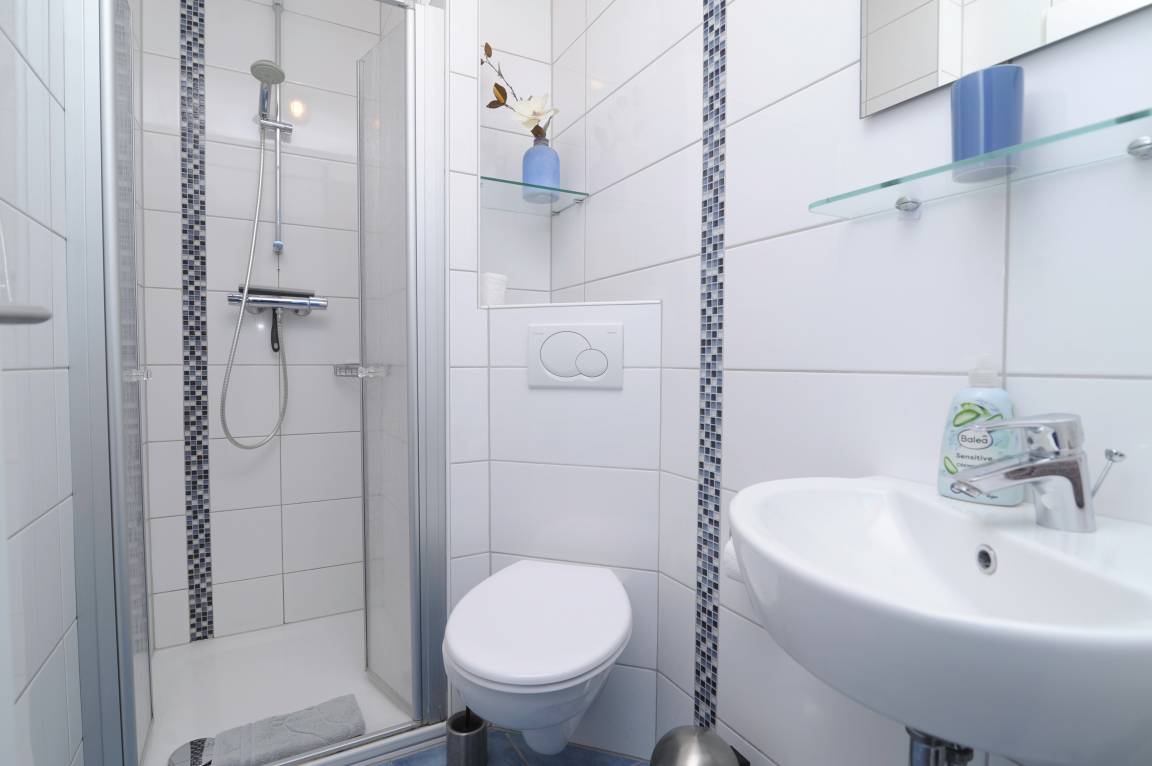 Das innenliegende Bad ist klein aber fein und ist mit einem WC, einer Dusche mit niedrigem Einstieg und einem Handtuchtrockner ausgestattet.