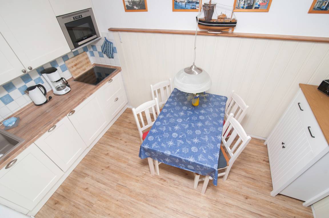 Ein großzügiges und helles Wohnzimmer mit bequemem Ecksofa lassen den Tag bei einem gemütlichen Fernsehabend ausklingen. Es gibt außerdem einen Essplatz neben der Einbauküche, die mit einem Geschirrspüler, Induktionskochfeld, Mikrowelle, Kühlschrank mit Gefrierfach, Filterkaffeemaschine, Toaster, Wasserkocher und weiteren Küchenutensilien keine Wünsche offen lässt. Vom Wohnzimmer aus gelangen Sie direkt auf die eigene Terrasse mit Sitzmöbeln - kurze Wege für einen nachmittags Tee auf der Terrasse.