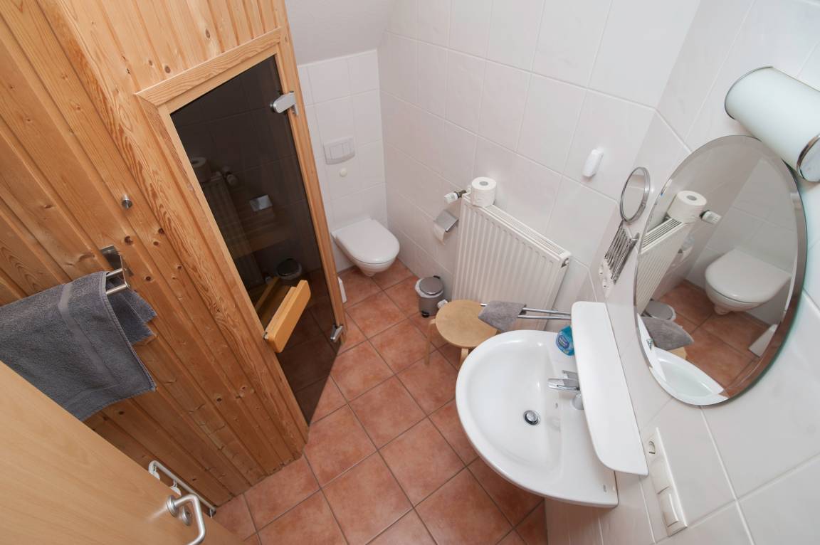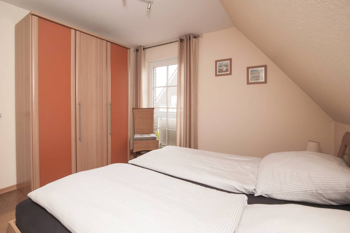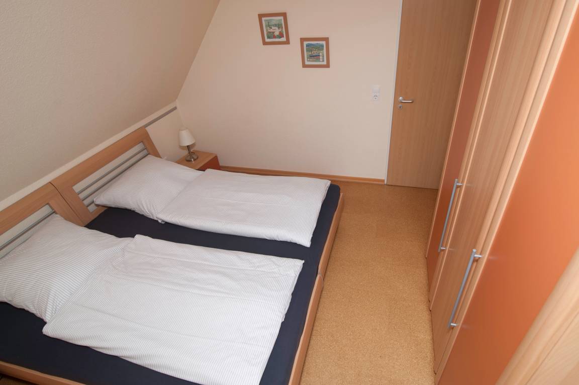 Es gibt drei Schlafzimmer: ein Doppelbett (2 x 90 x 200 cm), zwei Einzelbetten gleicher Größe und ein drittes Schlafzimmer auf der Galerie mit zwei Einzelbetten (100 x 200 cm). Die Wohnung verfügt über Außenrollos und Insektenschutzgitter. Im Innenliegenden Bad befinden sich eine Dusche mit niedrigem Einstieg, ein WC. Hier befindet sich auch die Sauna. Eine Waschmaschine (5 kg) und ein Wäscheständer stehen im Abstellraum zur Verfügung.
