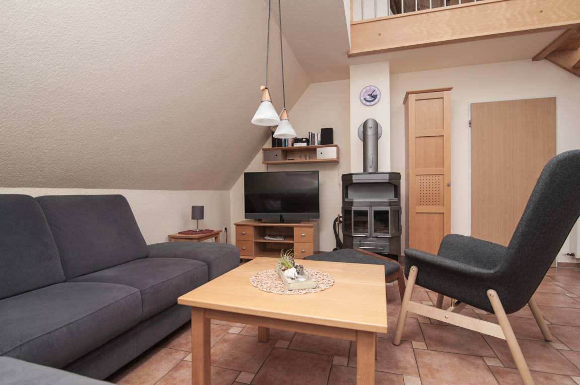 Die Einbauküche ist voll ausgestattet mit Geschirrspüler, Kühlschrank, separatem Gefrierschrank, Mikrowelle, Herd mit Cerankochfeld und Dunstabzugshaube. Die Wohnung verfügt über einen Kaminofen, der besonders an ungemütlichen Tagen für eine gemütliche Atmosphäre sorgt., auch die Sauna garantiert entspannte Stunden.