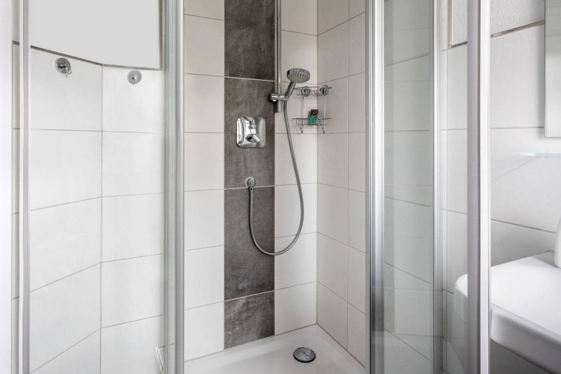 Das Wohlfühl-Bad verwöhnt mit Glasdusche, einem großen Spiegel und viel Tageslicht.
