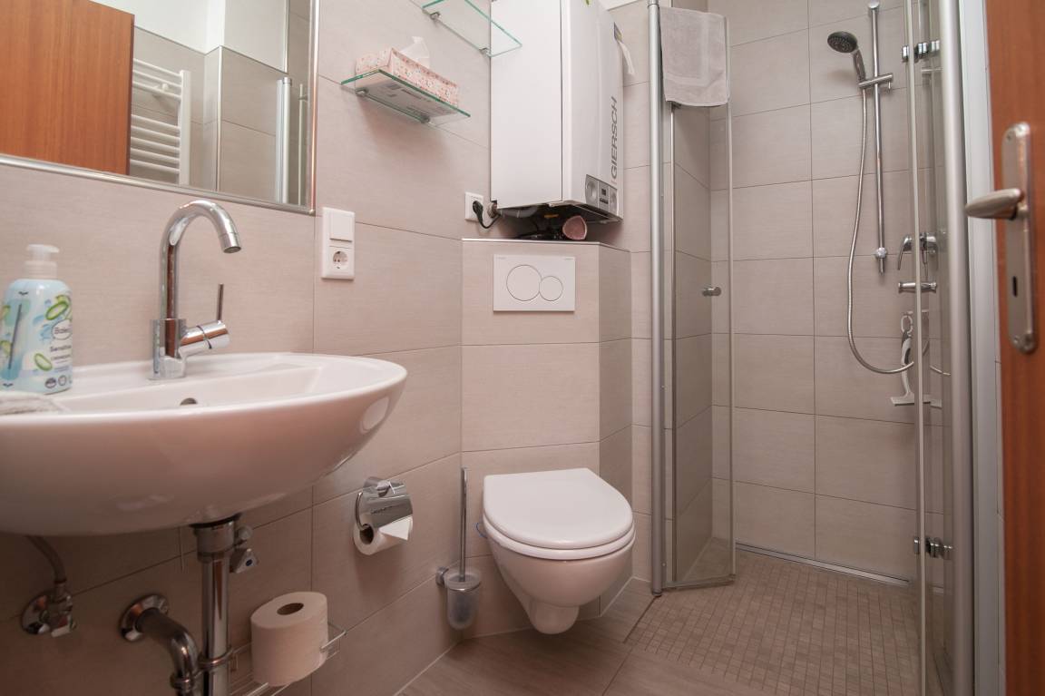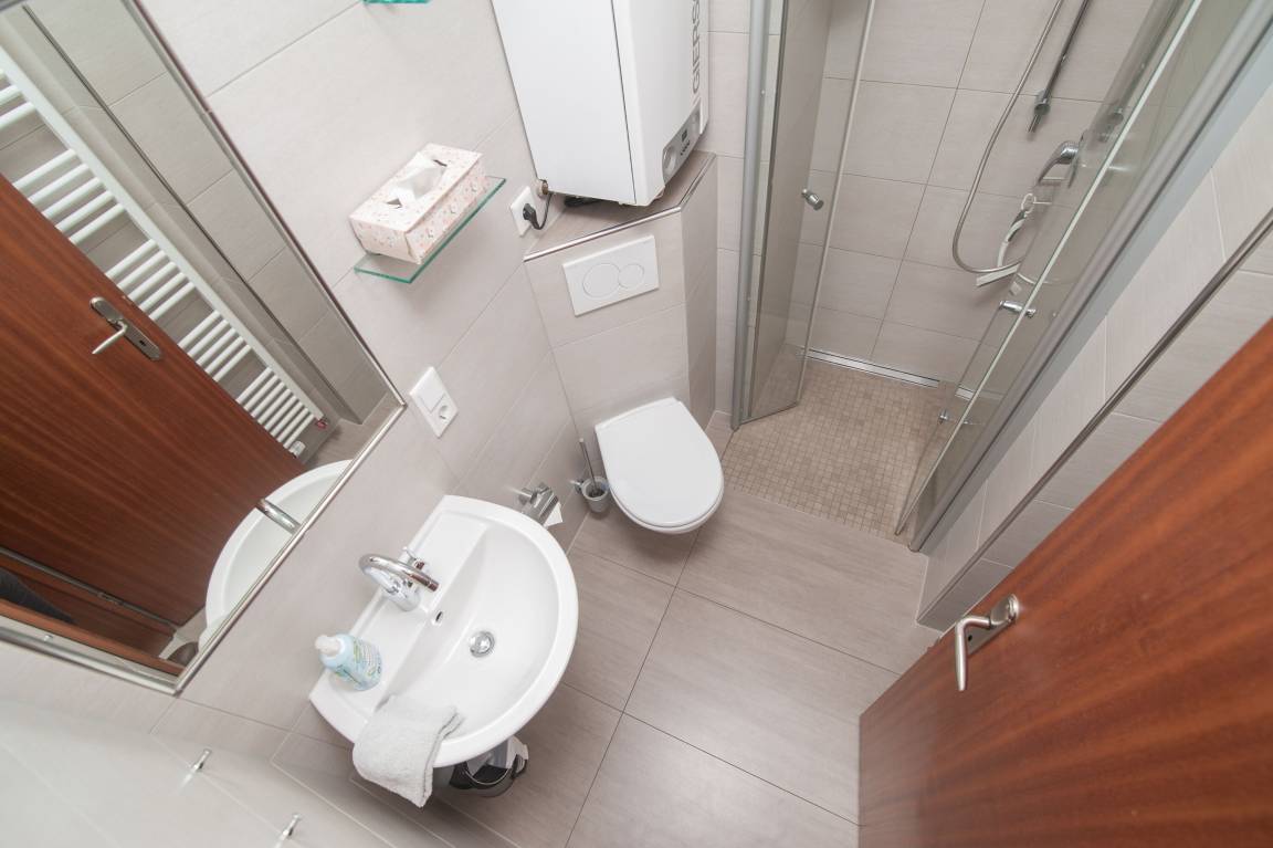 Ein kleines, modernes innenliegendes Badezimmer mit ebenerdiger Dusche, WC und einem Handtuchtrockner sorgen für Komfort. Ein kleiner Abstellraum ist ebenfalls vorhanden.