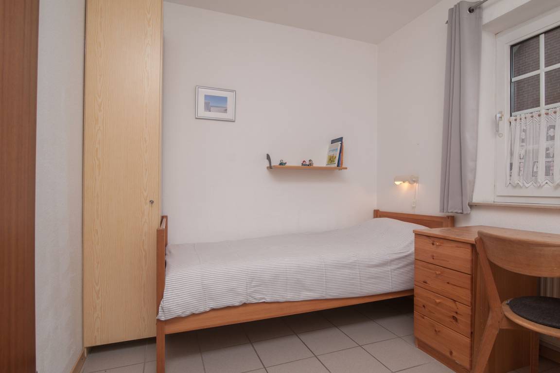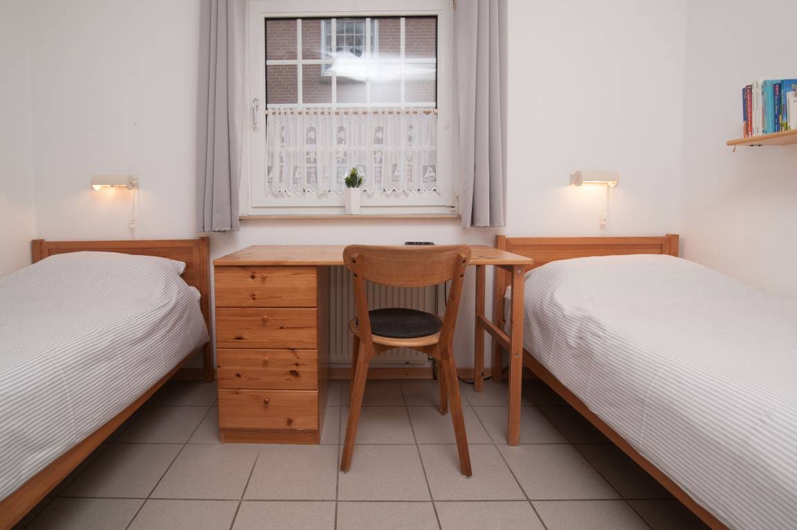 2 Schlafräume: Ein Schlafzimmer mit Doppelbett (2 x 90 x 200cm), zweites Schlafzimmer mit 2 Einzelbetten (90 x 200cm) und Schreibtisch.