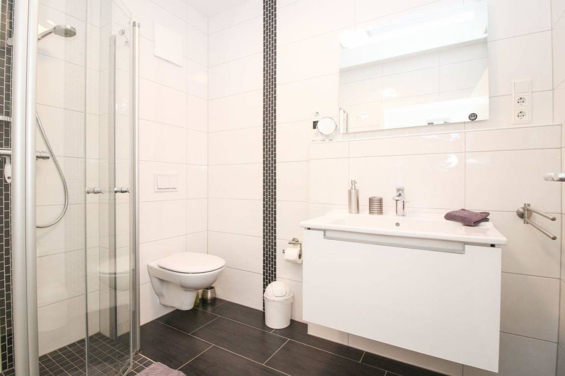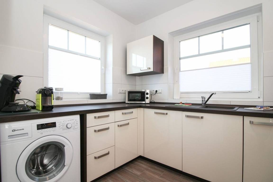 Die Wohnung verfügt über eine komplett eingerichtete, separate Küche mit sämtlichen Elektrogeräten (Spülmaschine, Waschmaschine, Nespresso-/Kaffeepad-/Filterkaffee-Maschine etc.), Wohn-/Essbereich, Schlafzimmer mit Doppelbett und einem Bad mit ebenerdiger Dusche.