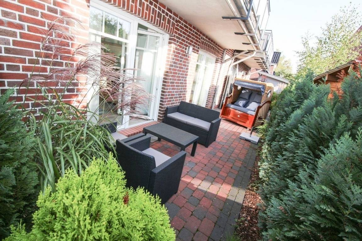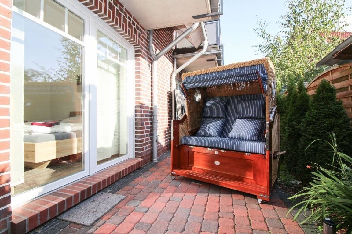 Eine Süd-Terrasse mit Luxus-Strandkorb, Gartenstühlen/ -tisch, Sonnenschirm und Lounge Möbeln, die sowohl vom Schlafzimmer als auch vom Wohnzimmer betreten werden kann und ein PKW-Stellplatz gehören zur Wohnung.