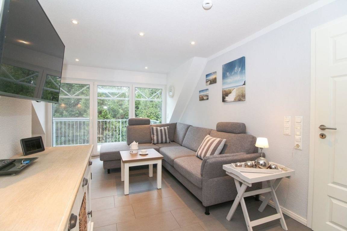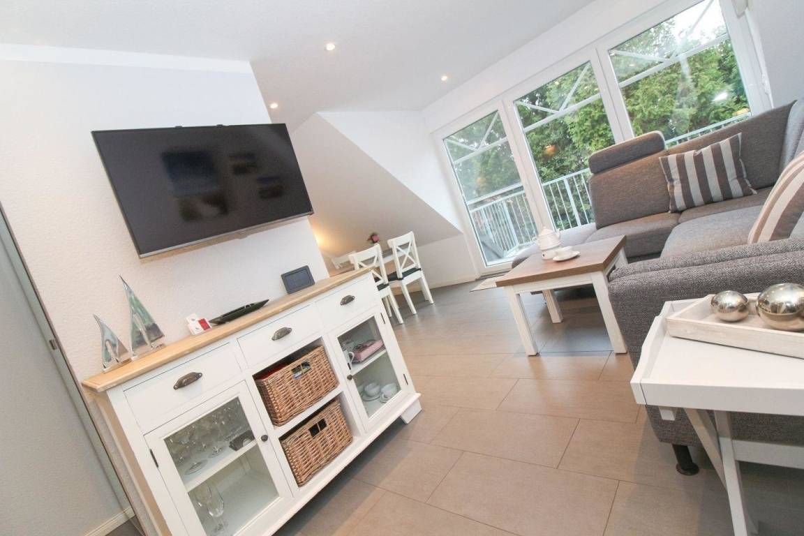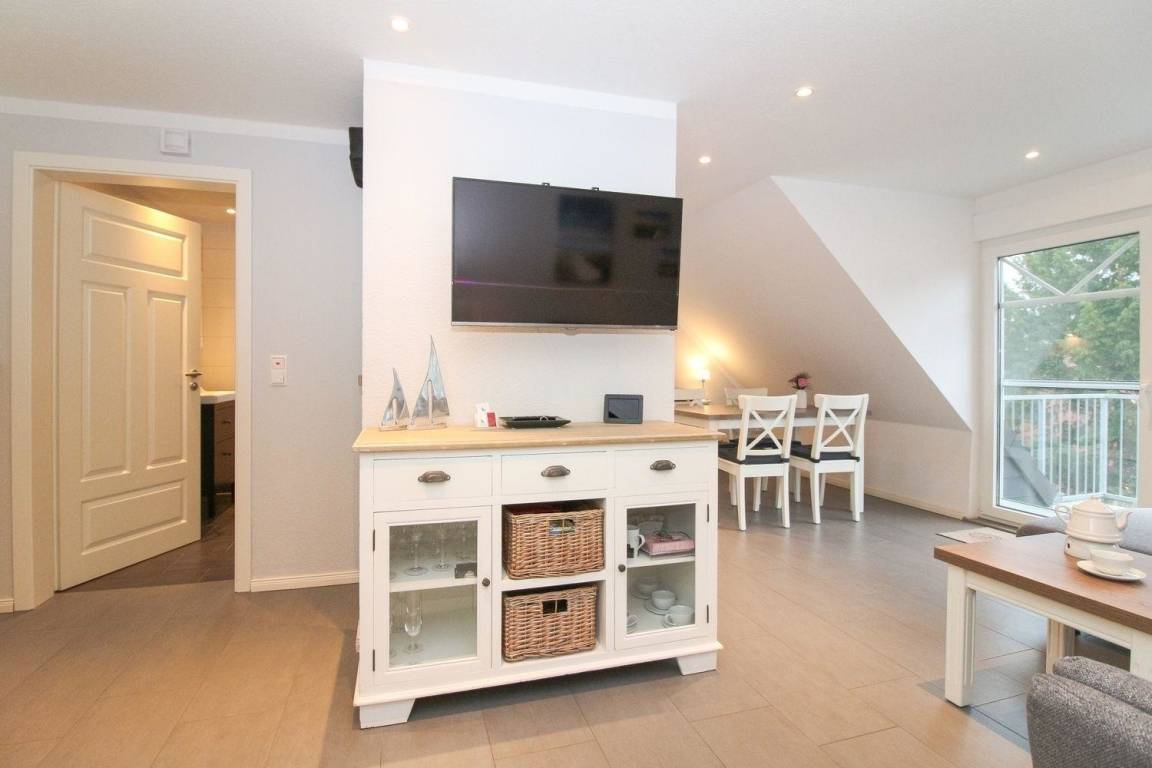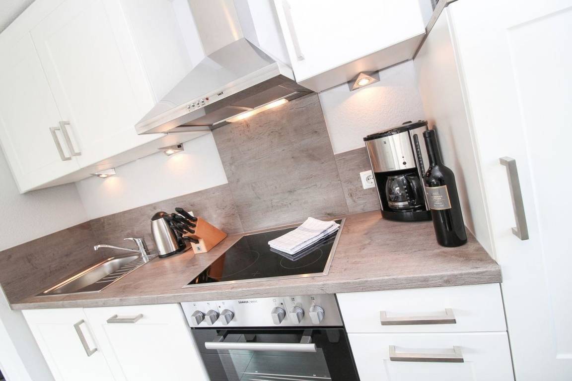 Im Wohn-/Essbereich befindet sich eine sehr gut ausgestattete Küchenzeile. Neben einem Kühlschrank mit Gefrierfach, Ceran-Kochfeld inkl. Backofen ist selbstverständlich eine Geschirrspülmaschine in der Küche verbaut. In einer Nische befindet sich ein Spiegelschrank mit Ganzkörperspiegel. Auf dem sonnigen Balkon können Sie den Abend, vielleicht bei einem Glas Rotwein, ausklingen lassen. Für die ganz kleinen Gäste stehen Kinderreisebett und Hochstuhl bereit.