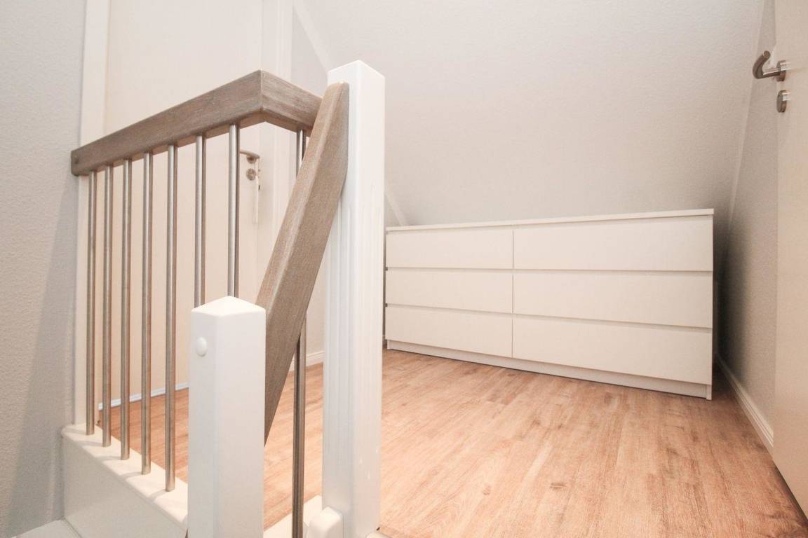 Der Flur im obersten Dachgeschoss kann als Abstellfläche genutzt werden, wobei die beiden Räume im obersten Dachgeschoss für Gäste nicht zugänglich sind. Insektenschutzgitter lässt Plagegeister nicht in die Wohnung gelangen.