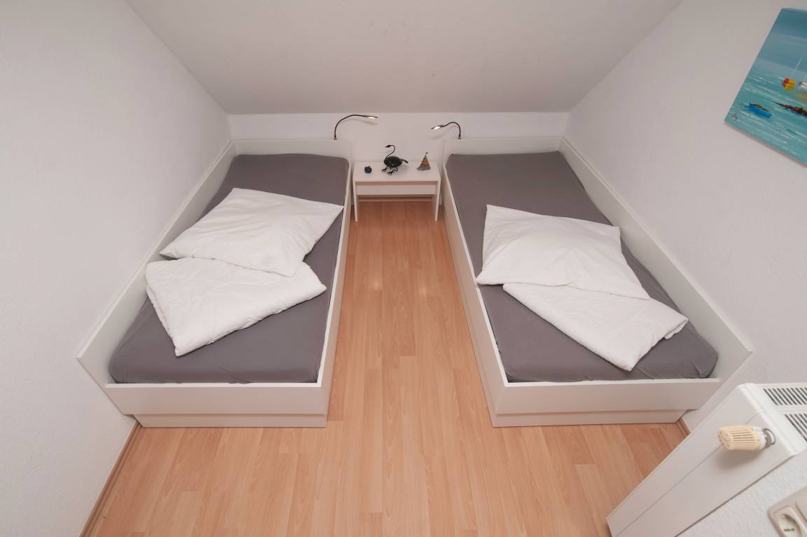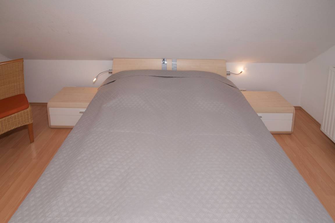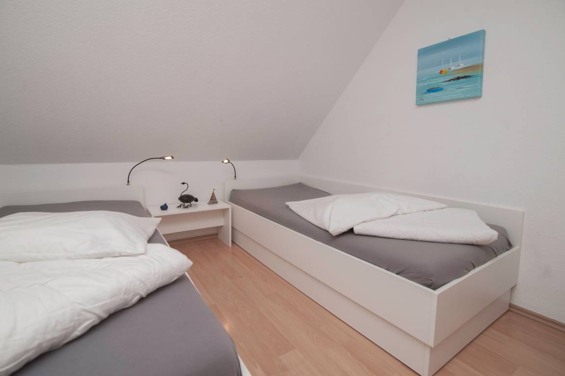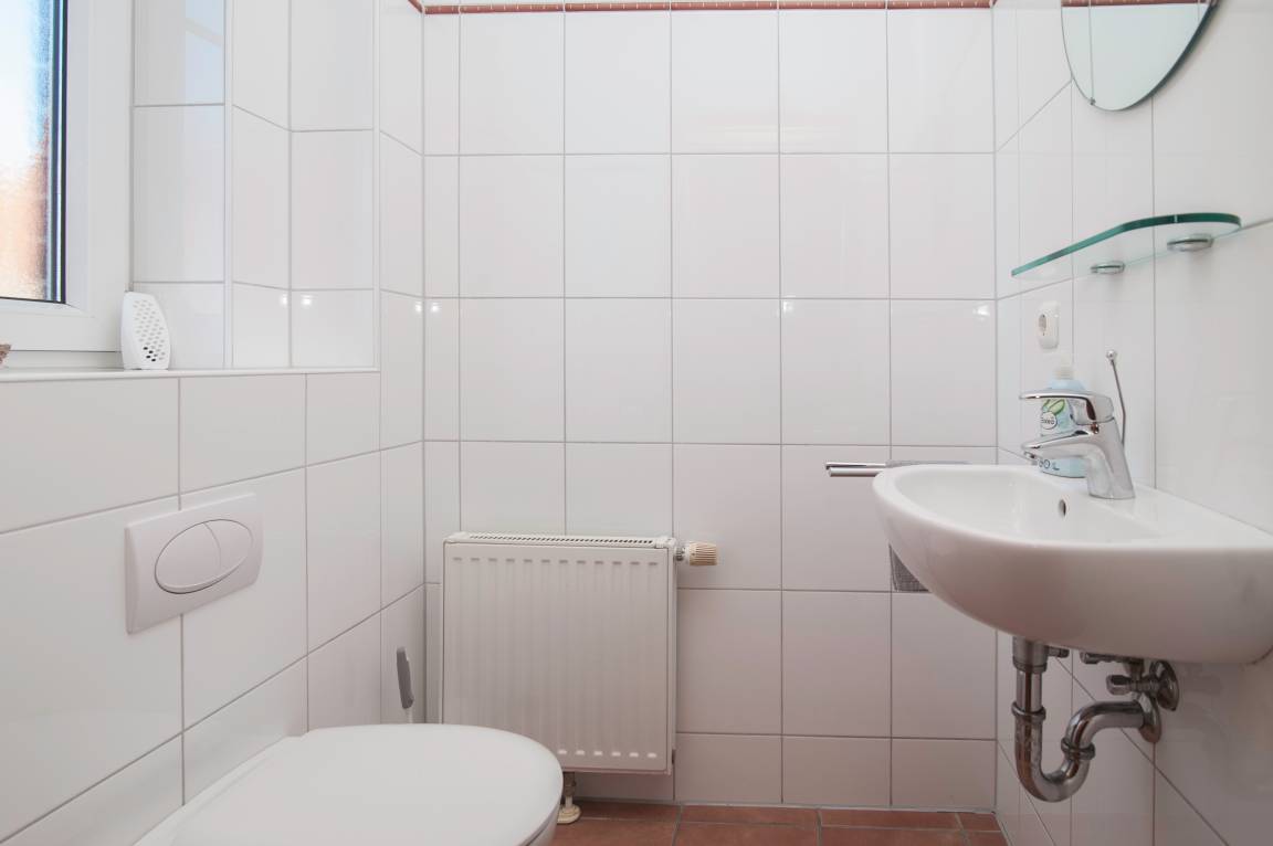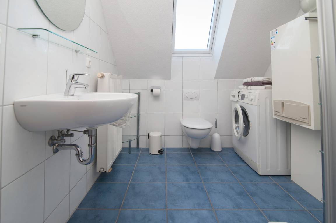 Badezimmer mit Dusche, Waschbecken und WC, Waschmaschine (4,5kg) und Föhn, sowie ein Schlafzimmer mit einem Doppelbett im Obergeschoß (2 x 100 x 200 cm) und ein Schlafzimmer mit zwei Einzelbetten (100 x 200 cm), alle Betten im Haus verfügen über verstellbare Lattenroste.