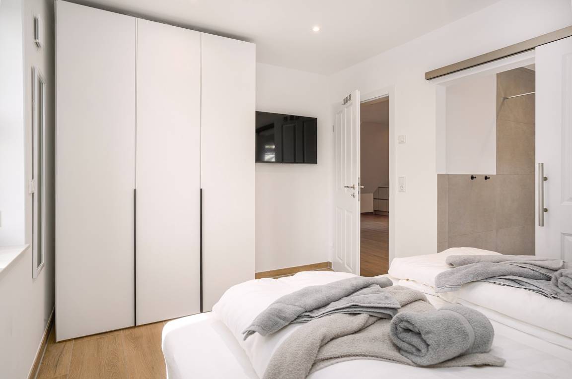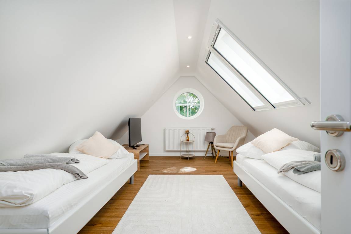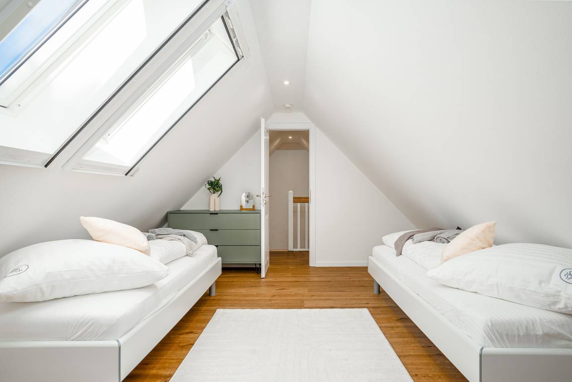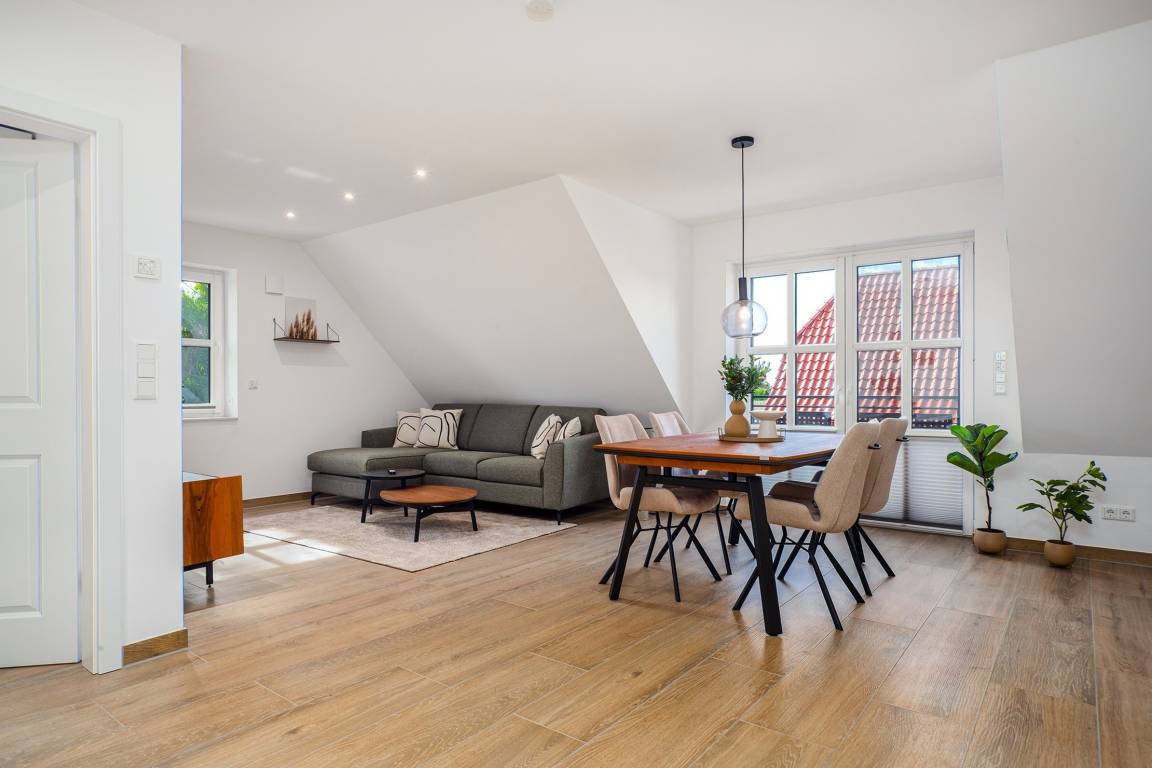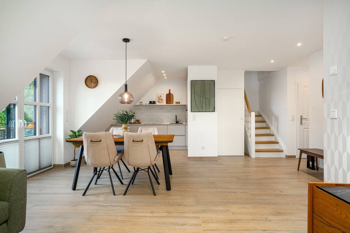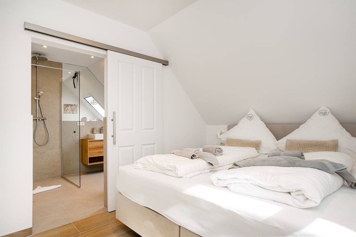 Die Ferienwohnung "Muuske" ist eine großzügige, stilvoll eingerichtete Unterkunft mit einer Größe von 70qm, die sich im Obergeschoss befindet. Der offene Wohn-Ess-Bereich der Wohnung ist besonders gemütlich und warm gestaltet, ideal zum Entspannen nach einem erlebnisreichen Tag. Der Raum besticht durch eine einladende Atmosphäre und bietet Zugang zu einem möbilierten Balkon, der zum Verweilen an der frischen Luft einlädt. Die hochwertige Küche ist modern und bestens ausgestattet, das Schlafzimmer mit Bad en Suite und Boxspringbett bietet zusätzlichen Komfort und Privatsphäre. Das dazugehörige Badezimmer verfügt über eine ebenerdige Dusche, die sowohl komfortabel als auch stilvoll ist. Ein weiteres Highlight ist das zweite kleine Tageslichtbad, das ebenfalls mit einer ebenerdigen Dusche ausgestattet ist und somit besonders praktisch für den Urlaub mit der Familie oder Freunden ist. Im ausgebauten Spitzboden finden Sie ein weiteres abgeschlossenes Schlafzimmer mit zwei gemütlichen Einzelbetten und einem Lesesessel – perfekt für Kinder oder weitere Gäste. Selbstverständlich steht Ihnen auch ein eigener Parkplatz, sowie Abstellmöglichkeiten für Fahrräder zur Verfügung.
