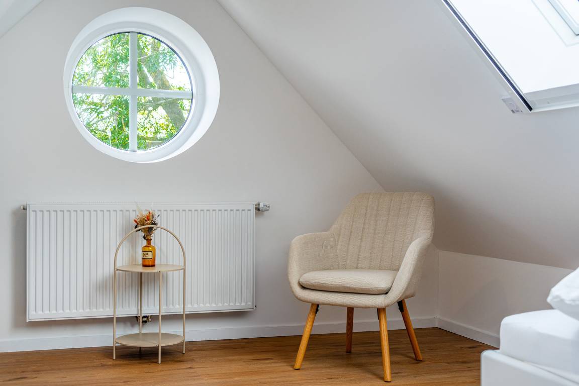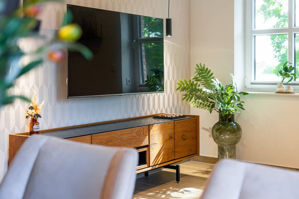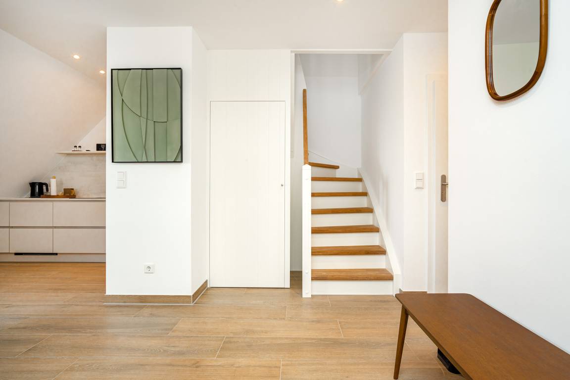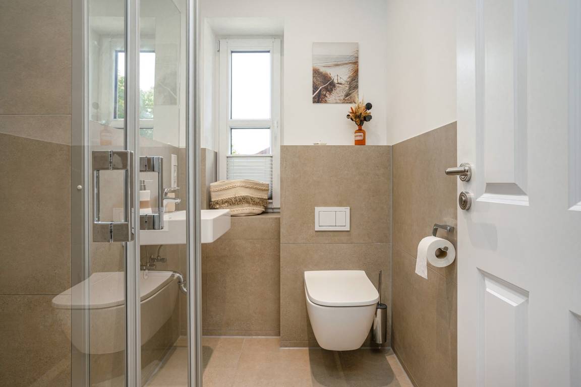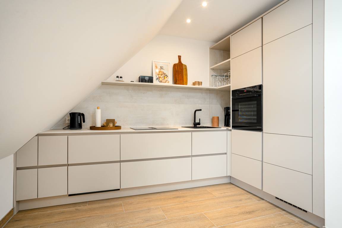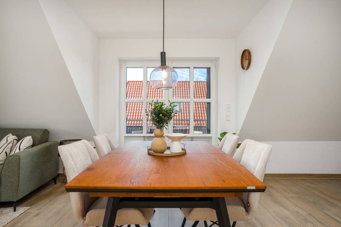 Die Ferienwohnung "Muuske" ist eine großzügige, stilvoll eingerichtete Unterkunft mit einer Größe von 70qm, die sich im Obergeschoss befindet. Der offene Wohn-Ess-Bereich der Wohnung ist besonders gemütlich und warm gestaltet, ideal zum Entspannen nach einem erlebnisreichen Tag. Der Raum besticht durch eine einladende Atmosphäre und bietet Zugang zu einem möbilierten Balkon, der zum Verweilen an der frischen Luft einlädt. Die hochwertige Küche ist modern und bestens ausgestattet, das Schlafzimmer mit Bad en Suite und Boxspringbett bietet zusätzlichen Komfort und Privatsphäre. Das dazugehörige Badezimmer verfügt über eine ebenerdige Dusche, die sowohl komfortabel als auch stilvoll ist. Ein weiteres Highlight ist das zweite kleine Tageslichtbad, das ebenfalls mit einer ebenerdigen Dusche ausgestattet ist und somit besonders praktisch für den Urlaub mit der Familie oder Freunden ist. Im ausgebauten Spitzboden finden Sie ein weiteres abgeschlossenes Schlafzimmer mit zwei gemütlichen Einzelbetten und einem Lesesessel – perfekt für Kinder oder weitere Gäste. Selbstverständlich steht Ihnen auch ein eigener Parkplatz, sowie Abstellmöglichkeiten für Fahrräder zur Verfügung.