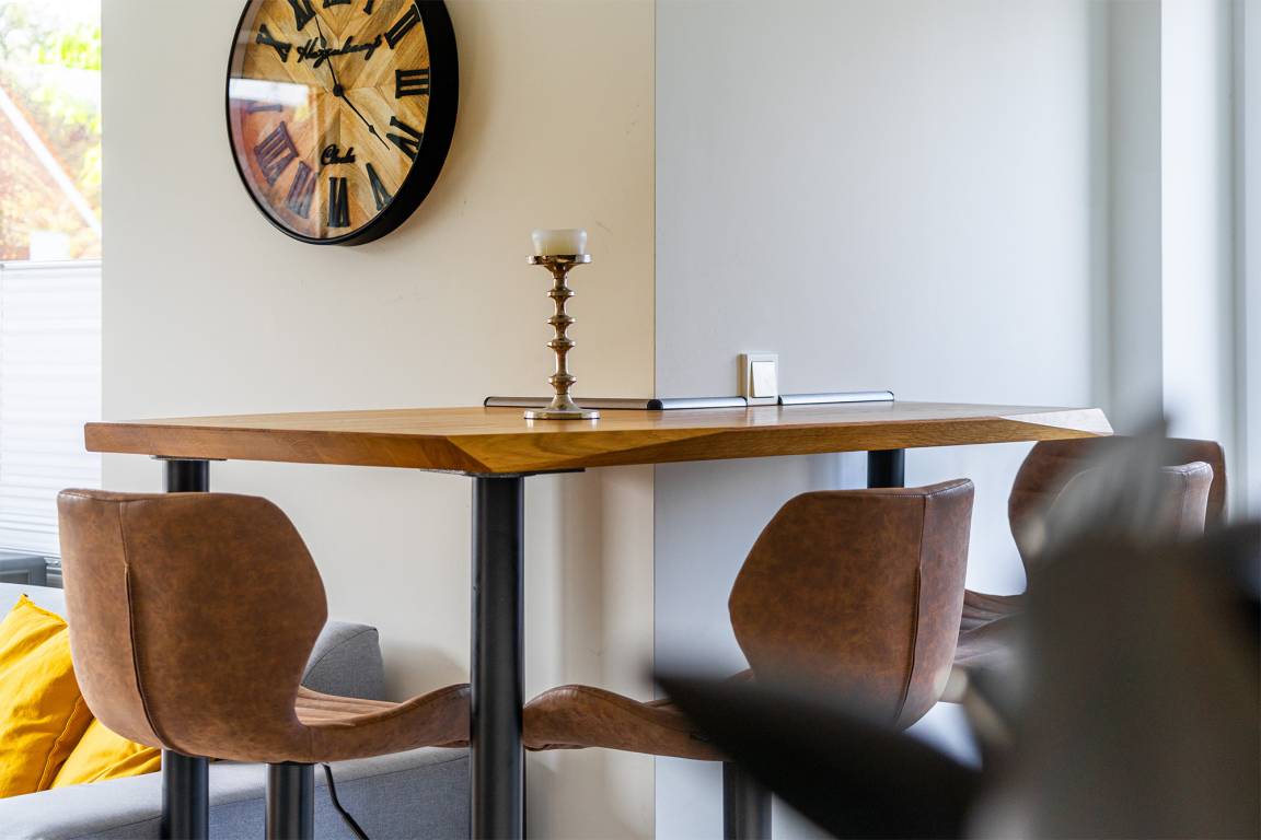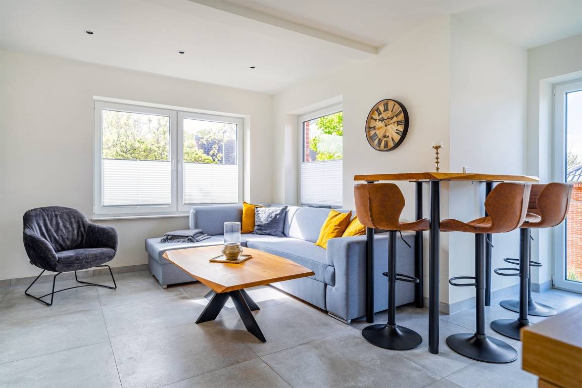 Unsere Wohnung "Die Zimmerei 2" bietet sich mit ihren etwa 70qm als perfektes Urlaubsdomizil an. Sehr zentral und dennoch ruhig in einer durchfahrtsbeschränkten Straße gelegen bietet sie einen hellen und modernen Wohn-Ess-Bereich mit einer großzügigen und voll ausgestatteten Küchenzeile, sowie einen Esstisch (Hochtisch). Sie finden außerdem zwei Schlafzimmer mit bequemen und hochwertigen Boxpspringbetten sowie ein geräumiges Tageslichtbad. Auch ein Abstellraum mit einem Waschtrockner ist vorhanden. Trotz der Lage im Obergeschoss bietet die Wohnung außerdem eine Sonnenterrasse, die sie über den Hauseingang und eine Treppe im Garten erreichen. Selbstverständlich steht Ihnen ein eigener Parkplatz am Haus zur Verfügung. Sollten Sie mit einem E-Auto anreisen, verfügt das Objekt auch über eine Ladesäule, die Sie hinzu buchen können.