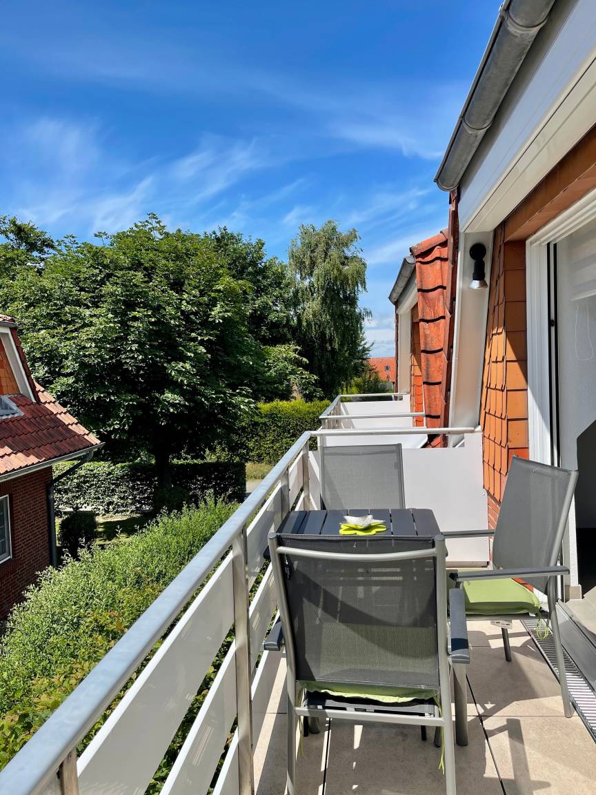 Ein heller Wohnraum mit gemütlichem Sofa und Sesseln hat direkten Zugang zum großen Balkon.