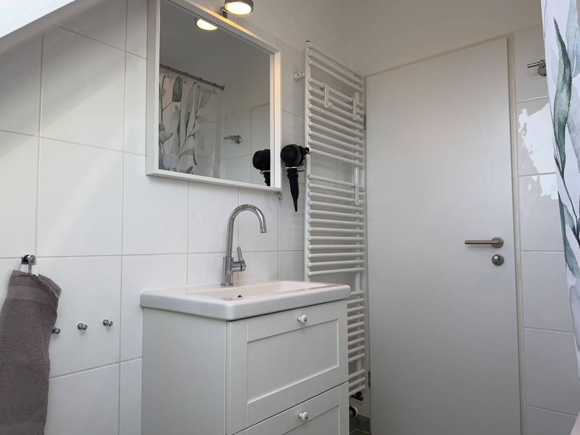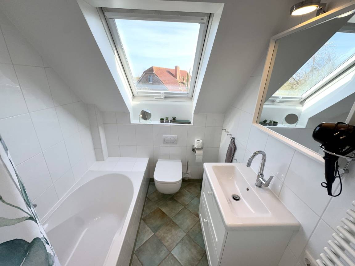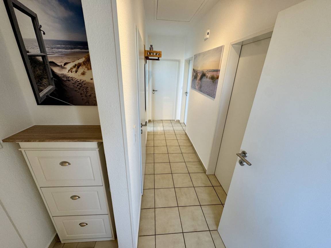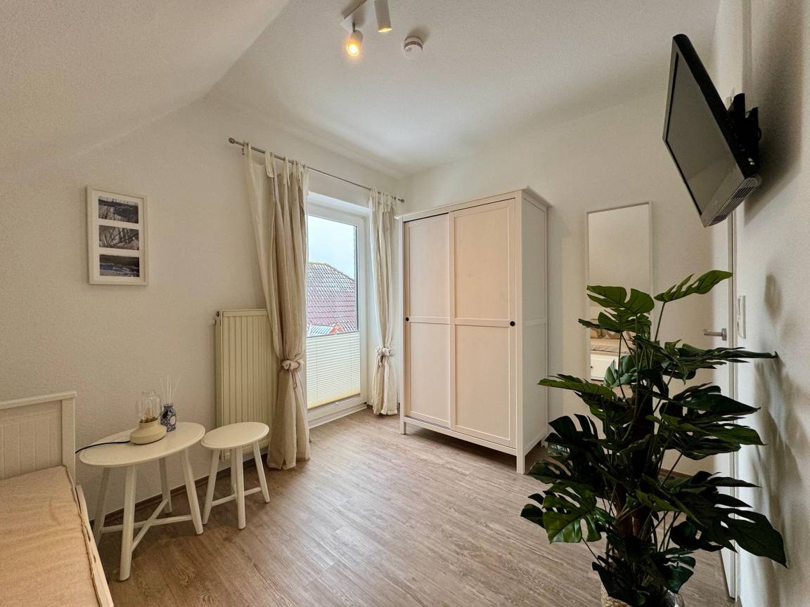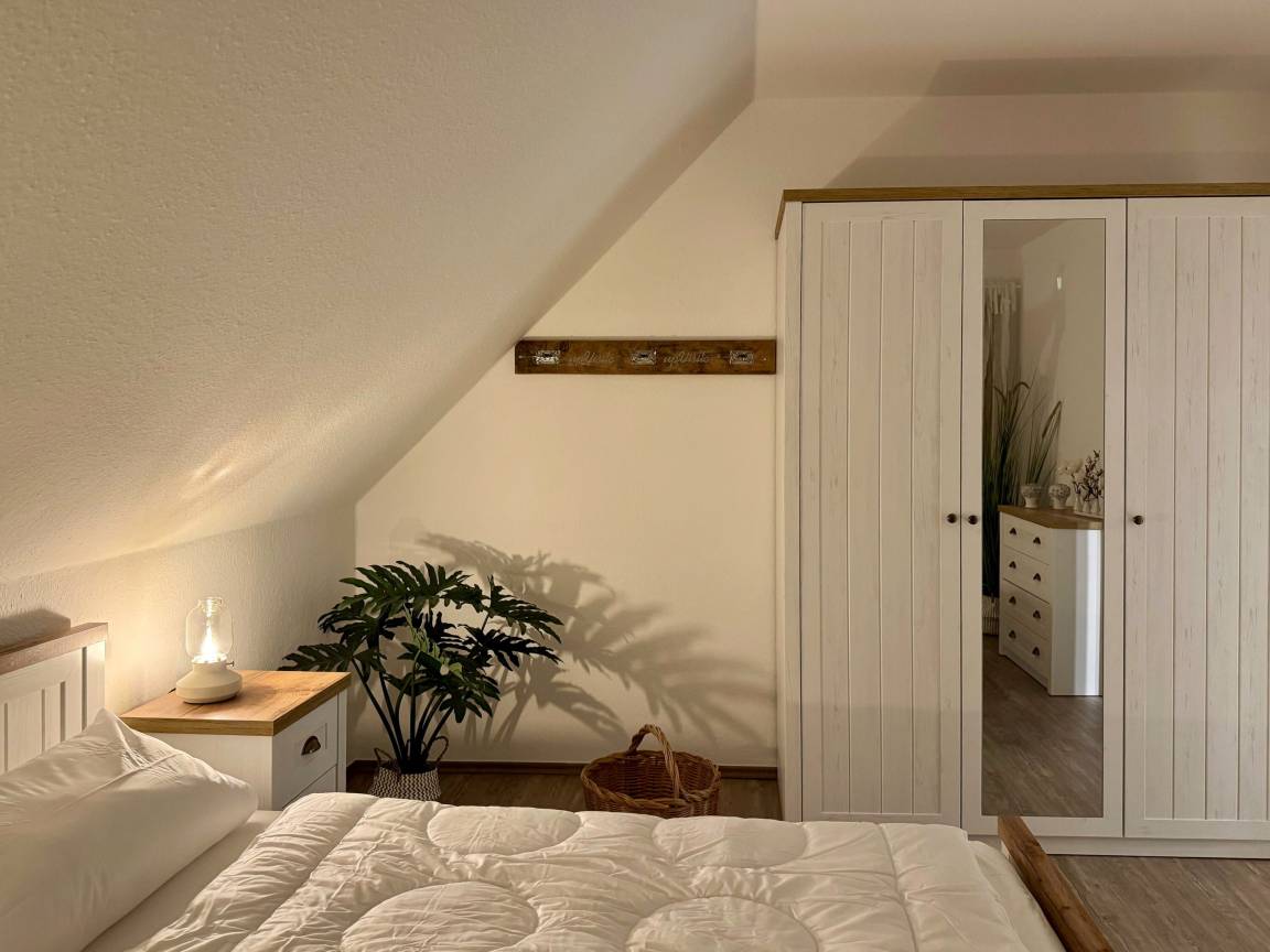 In der Wohnung gibt es zwei Schlafzimmer: eins mit einem Doppelbett, Kommode sowie Kleiderschrank und eins mit einem Einzelbett mit Lattenrost und Kleiderschrank. Im zweiten Schlafzimmer gibt es außerdem einen 26" Sony LCD-TV. Die Diele und das Badezimmer mit einer tiefgelegten Badewanne, die auch zum Duschen genutzt werden kann, bietet ausreichend Platz und eine behagliche Atmosphäre. Ein Föhn ist vorhanden. Bügelbrett, Bügeleisen und ein Wäscheständer stehen ebenfalls zur Verfügung. An den Fenstern befinden sich Insektenschutzgitter.