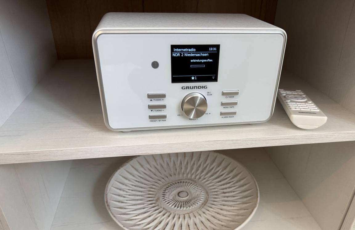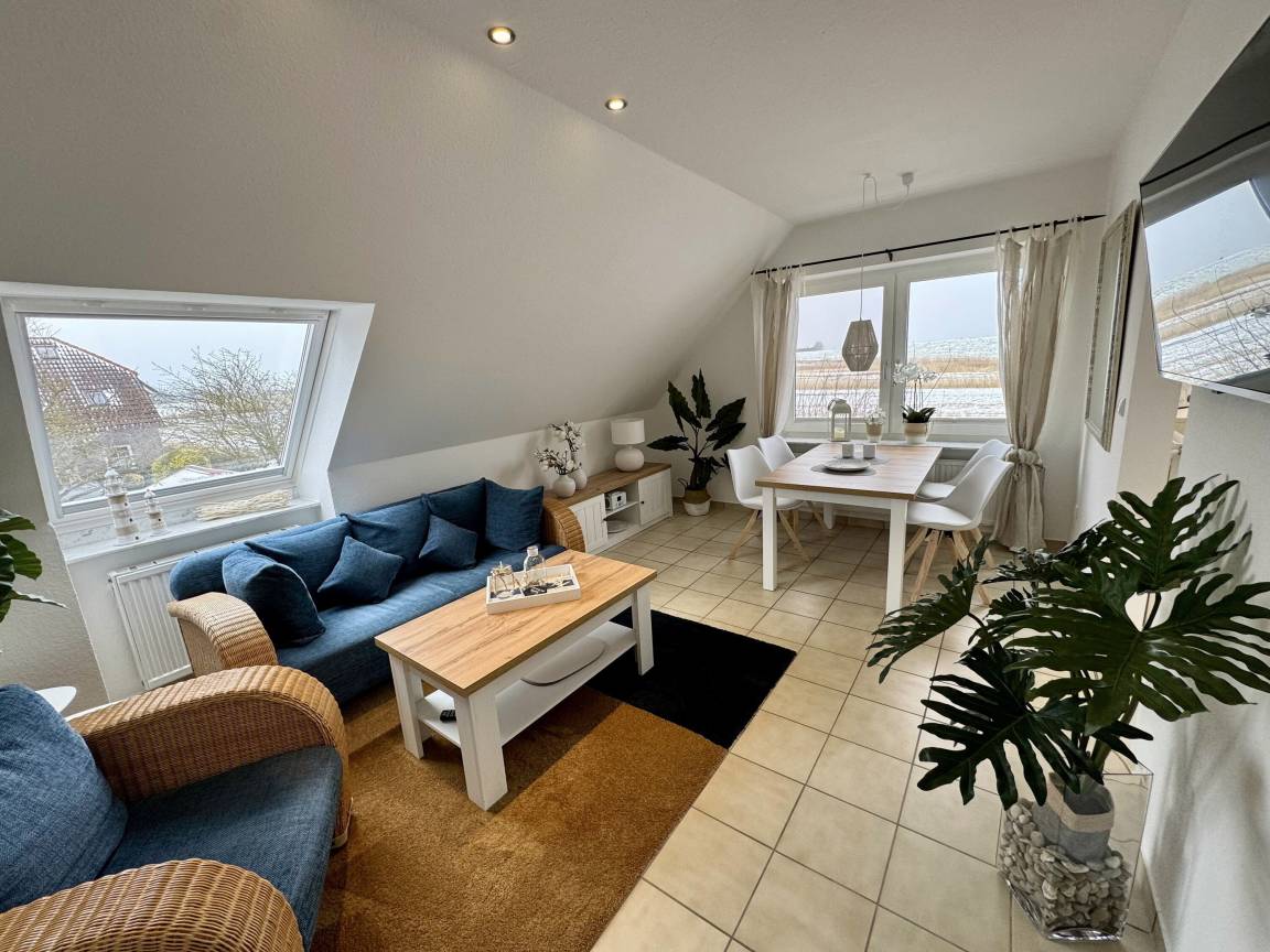 Der großzügige Wohnraum verfügt über eine Polstersitzgruppe mit einem 32" Panasonic Full HD LCD-TV, Internetradio und einem Essplatz für 4 Personen. Die Einbauküche ist komplett ausgestattet mit einem Herd inklusive Cerankochfeld, Mikrowelle, Geschirrspüler, Kühlschrank mit Gefrierfach, Filterkaffeemaschine, Senseo Pad-Maschine, Wasserkocher, Toaster, Eierkocher und vielem mehr. Wer Lust hat im Urlaub zu Backen findet hier Backutensilien.