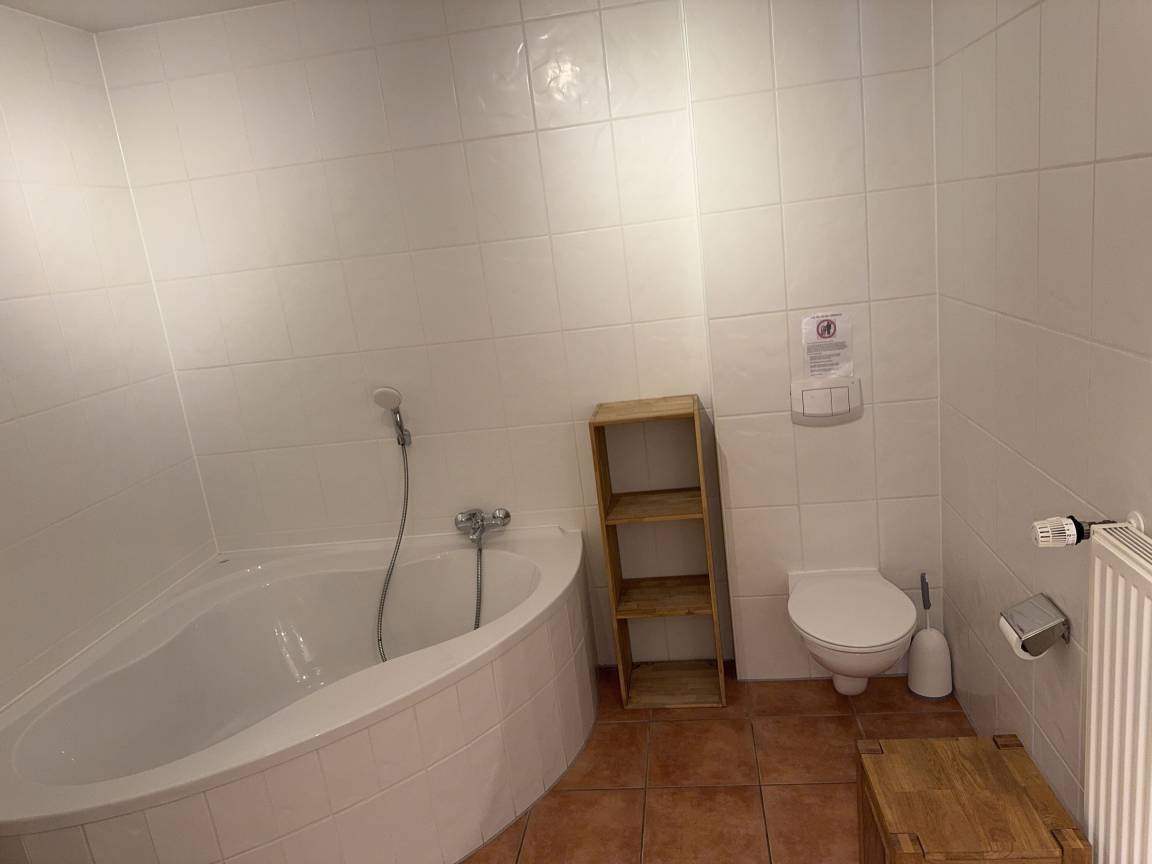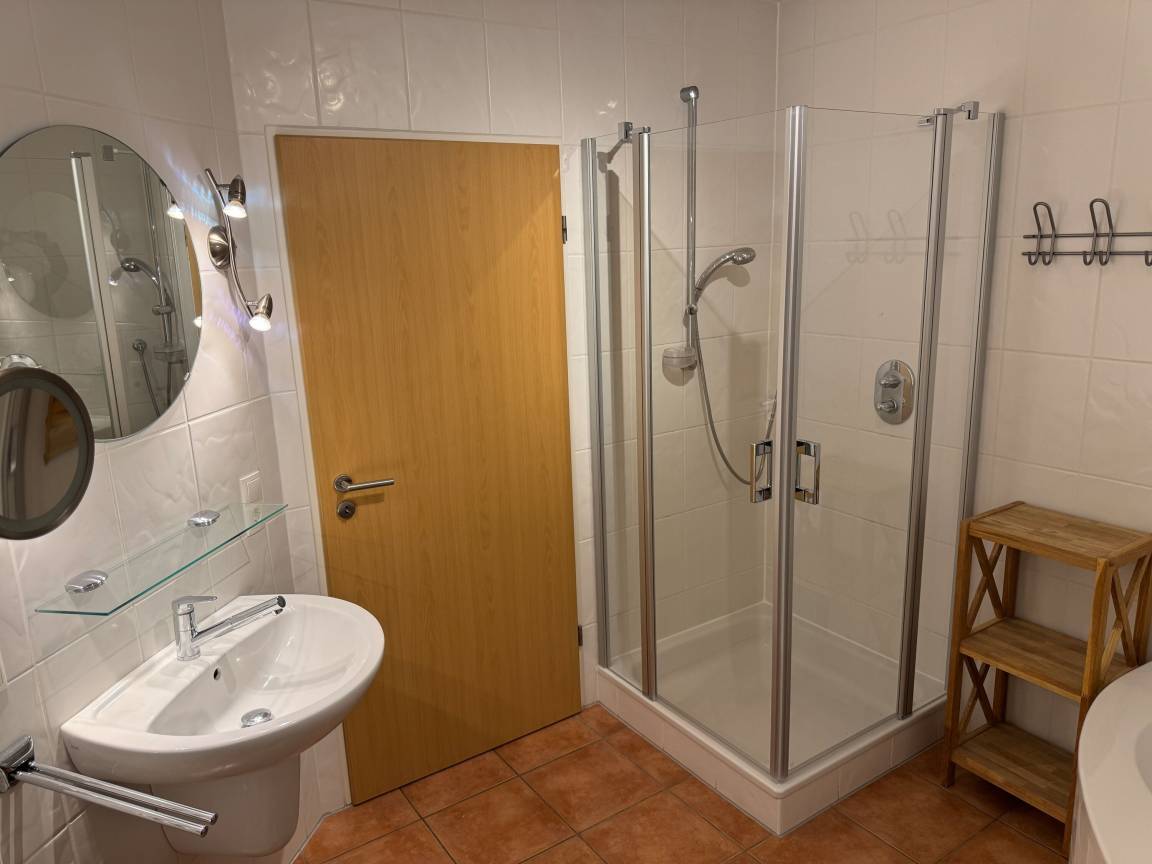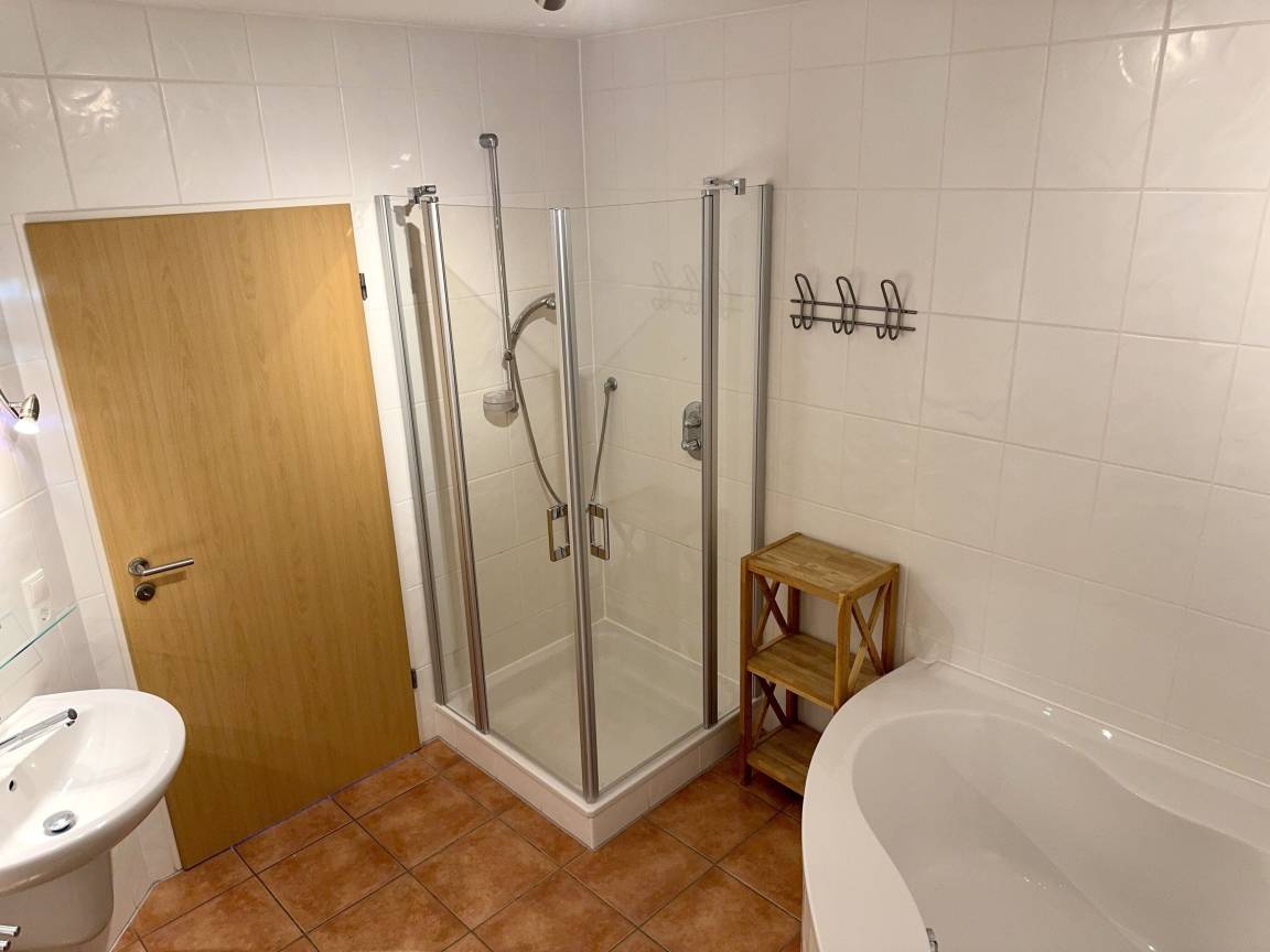 Das innenliegende Badezimmer mit einer Fußbodenheizung verfügt über eine Dusche, ein WC und einer Eckbadewanne. In einem kleinen Abstellraum befinden eine Waschmaschine (5 kg) und ein Kondenstrockner.