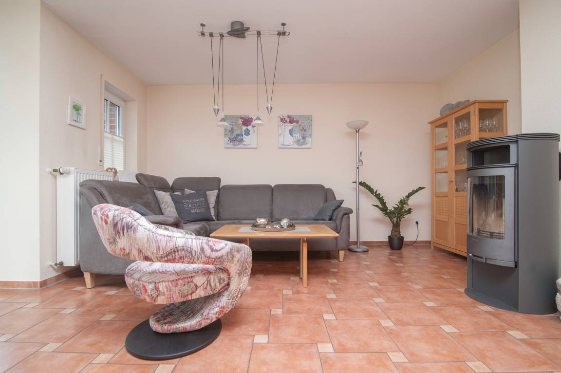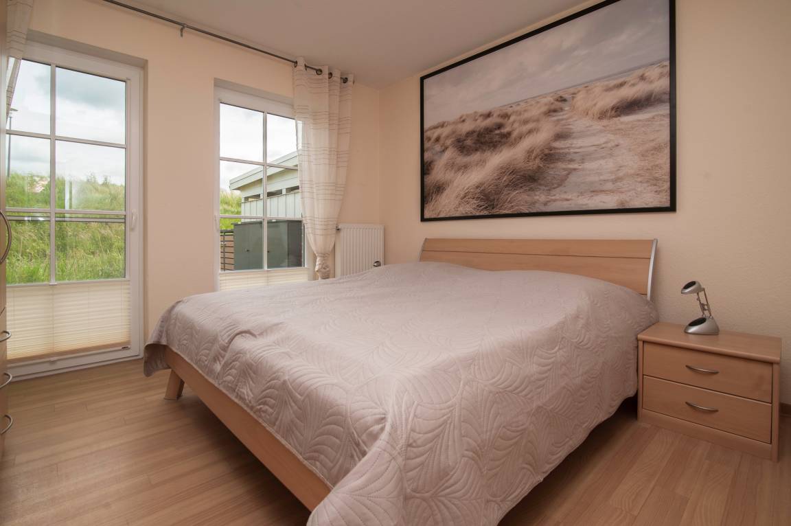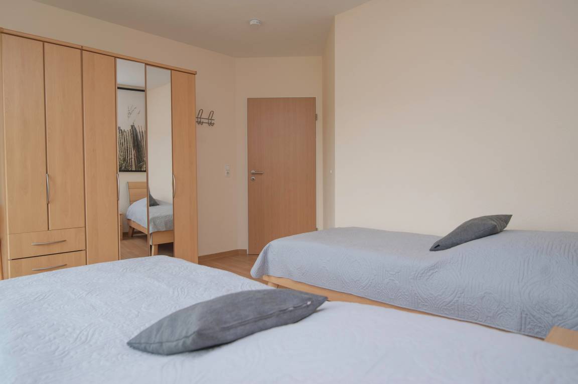 Für eine gemütliche Atmosphäre an kühlen Tagen sorgt der Kaminofen. Die Wohnung bietet Platz für 2 bis 4 Personen. Die Schlafzimmer sind jeweils mit einem Kleiderschrank ausgestattet, eines mit einem Doppelbett (2 x 90 x 200 cm) und das andere mit zwei Einzelbetten in der gleichen Größe. Alle Bettenverfügen über verstellbare Lattenroste. Außenrollos und Insektenschutzgitter sind ebenfalls vorhanden.