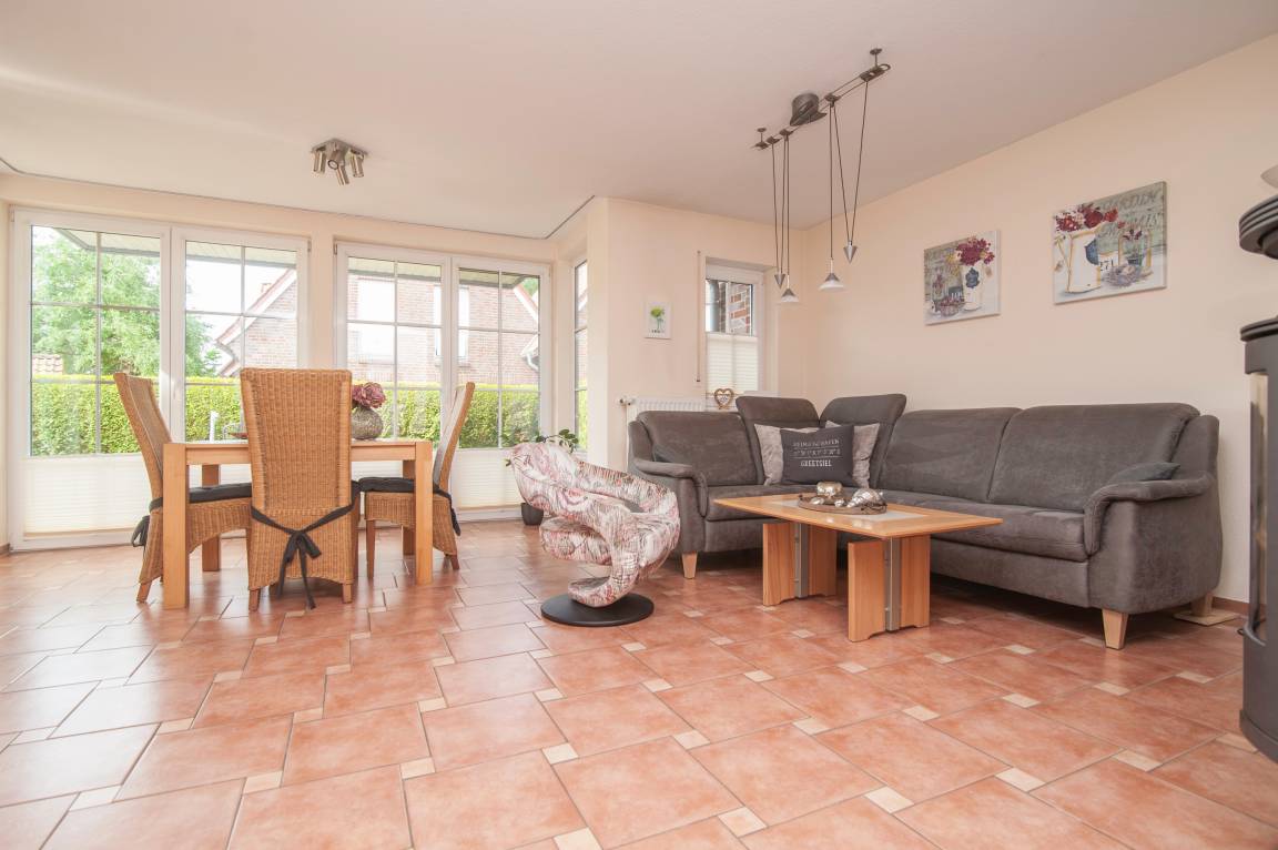 Die Ferienwohnung "Angelika" befindet sich im Erdgeschoß und liegt direkt hinter dem Deich in einer ruhigen Sackgassenlage. Sie bietet eine Wohnfläche von ca. 78 qm und ist ideal gelegen, da der malerische Greetsieler Hafen und der belebte Ortskern mit vielen Cafés und Restaurants nur wenige Gehminuten entfernt sind.