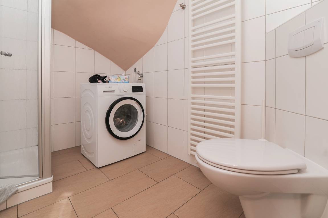 2 Schlafräume: einmal mit einem Doppelbett (160 x 200 cm) und einmal mit zwei Einzelbetten (90 x 200 cm). Bad mit Dusche, WC, Föhn, Waschtisch, Waschmaschine (7 kg) und Wäscheständer. Alle Räume sind gefliest. Vor den Fenstern befinden sich Insektenschutzgitter.