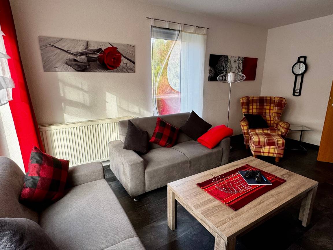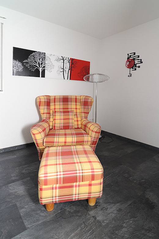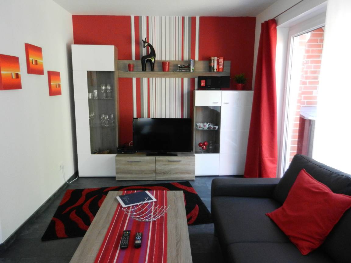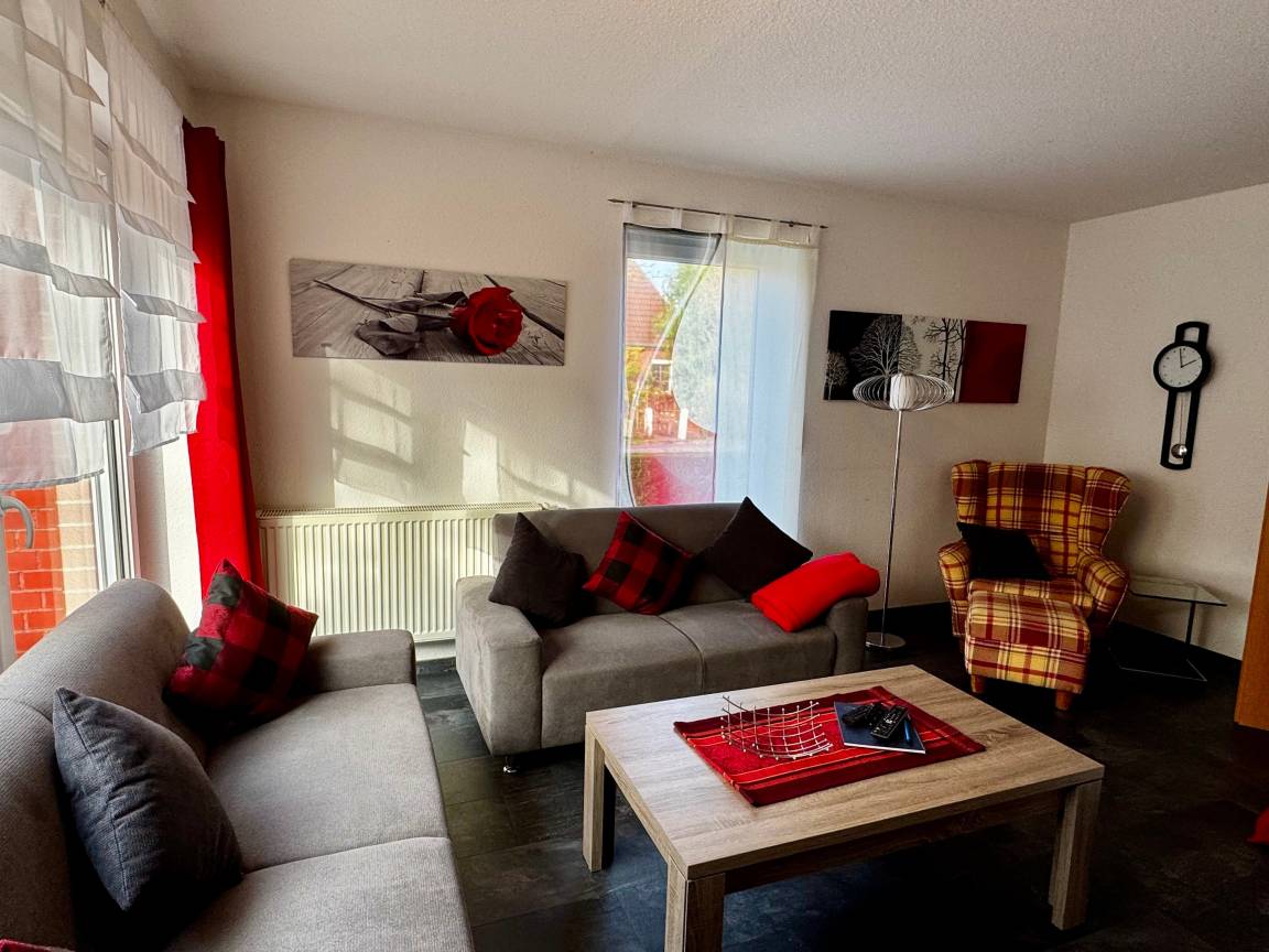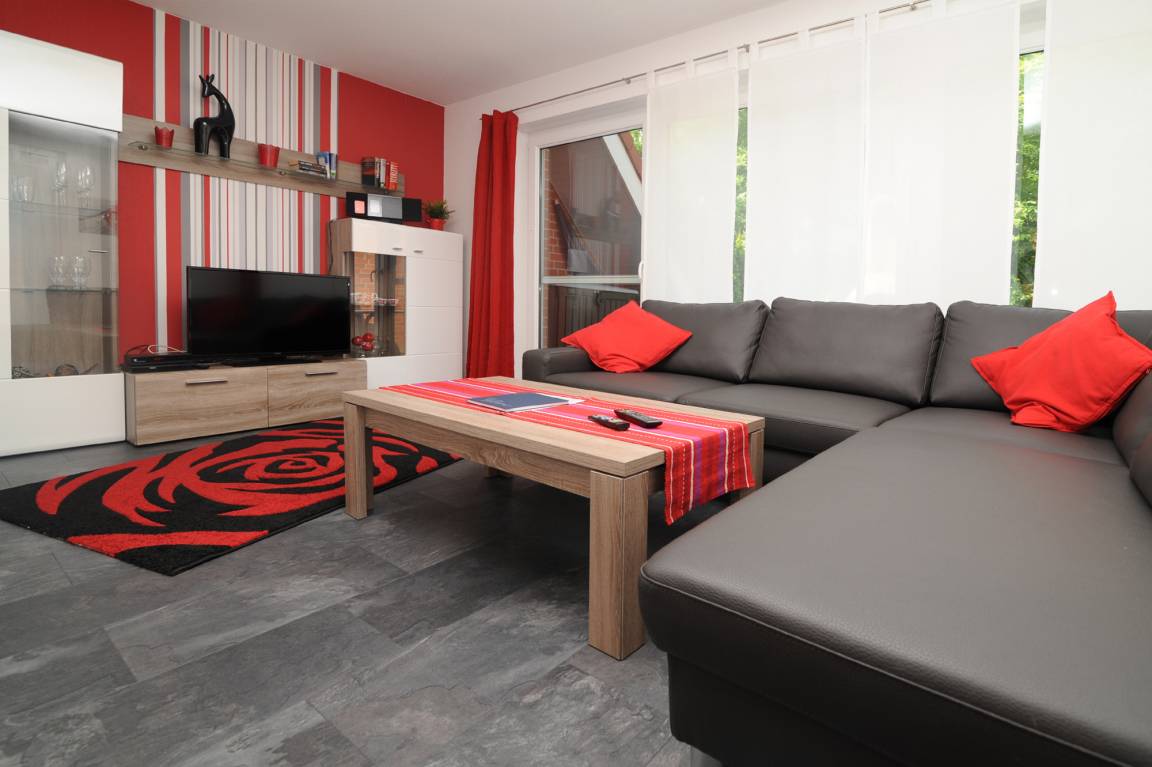 Geradeaus liegt das modern eingerichtete Wohnzimmer mit großen Panoramafenstern, die eine schöne Aussicht in den Garten ermöglichen. Während an den wärmeren Tagen die Terrasse und der Garten zum Entspannen oder zum Grillen einladen, ist es an kühleren Tagen im Wohnraum mit schönen Sofas zu richtig gemütlich bei einer Tasse ostfriesischem Tee.