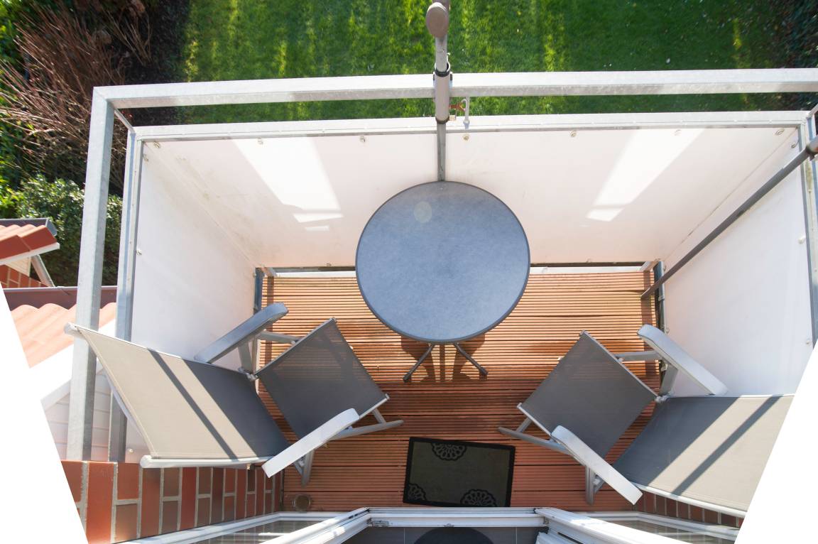 Auf dem kleinen Balkon mit 2 Stühlen, 1 Hocker, kleinem Tisch und Sonnenschirm können Sie die Sonne genießen. Insektenschutzgitter sind vor den meisten Fenstern und der Balkontür angebracht.