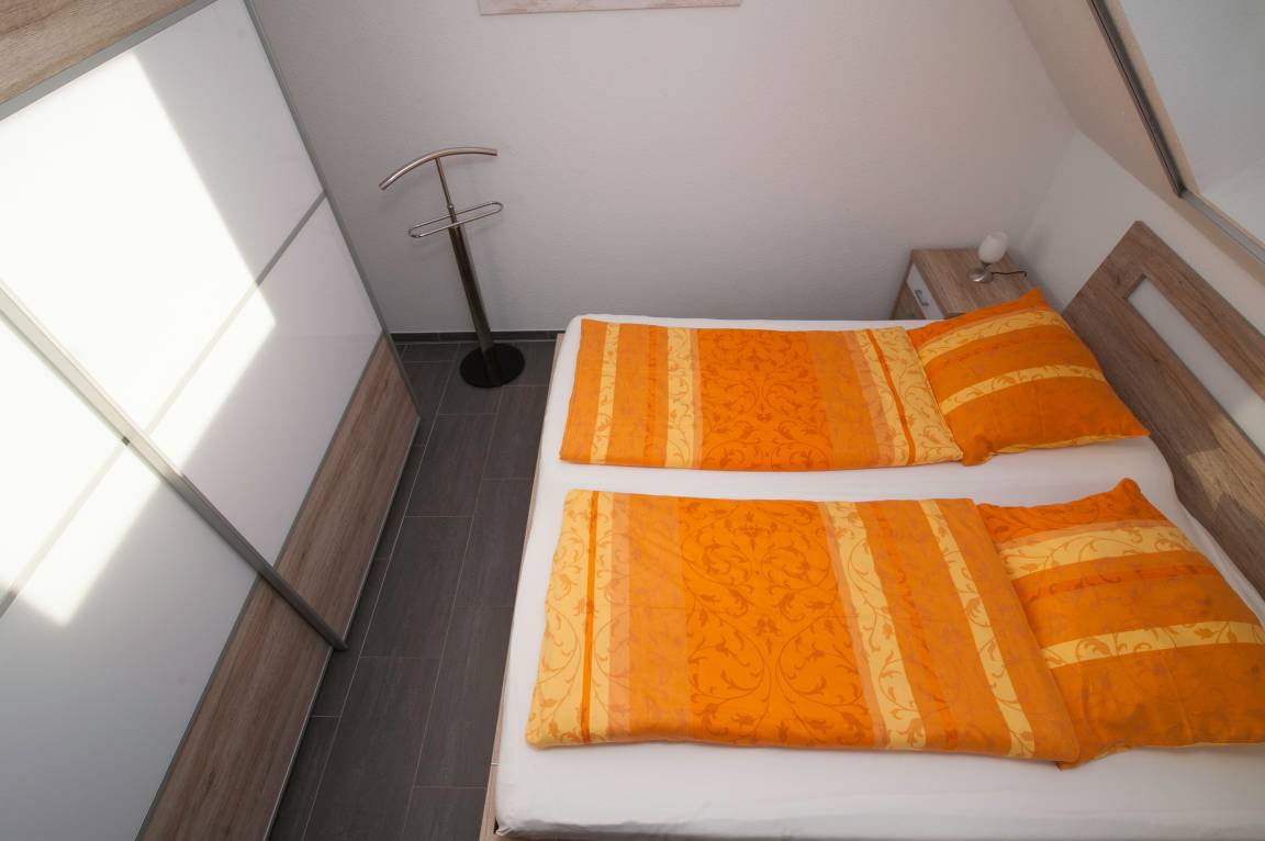 Die Wohnung verfügt über ein Schlafzimmer mit einem Doppelbett (2 x 90 x 200 cm) und großem Kleiderschrank sowie ein weiteres Schlafzimmer im großzügigen Studio unter dem Dach mit 2 Einzelbetten (90 x 200 cm) und einem 40 Zoll Flachbild-TV.