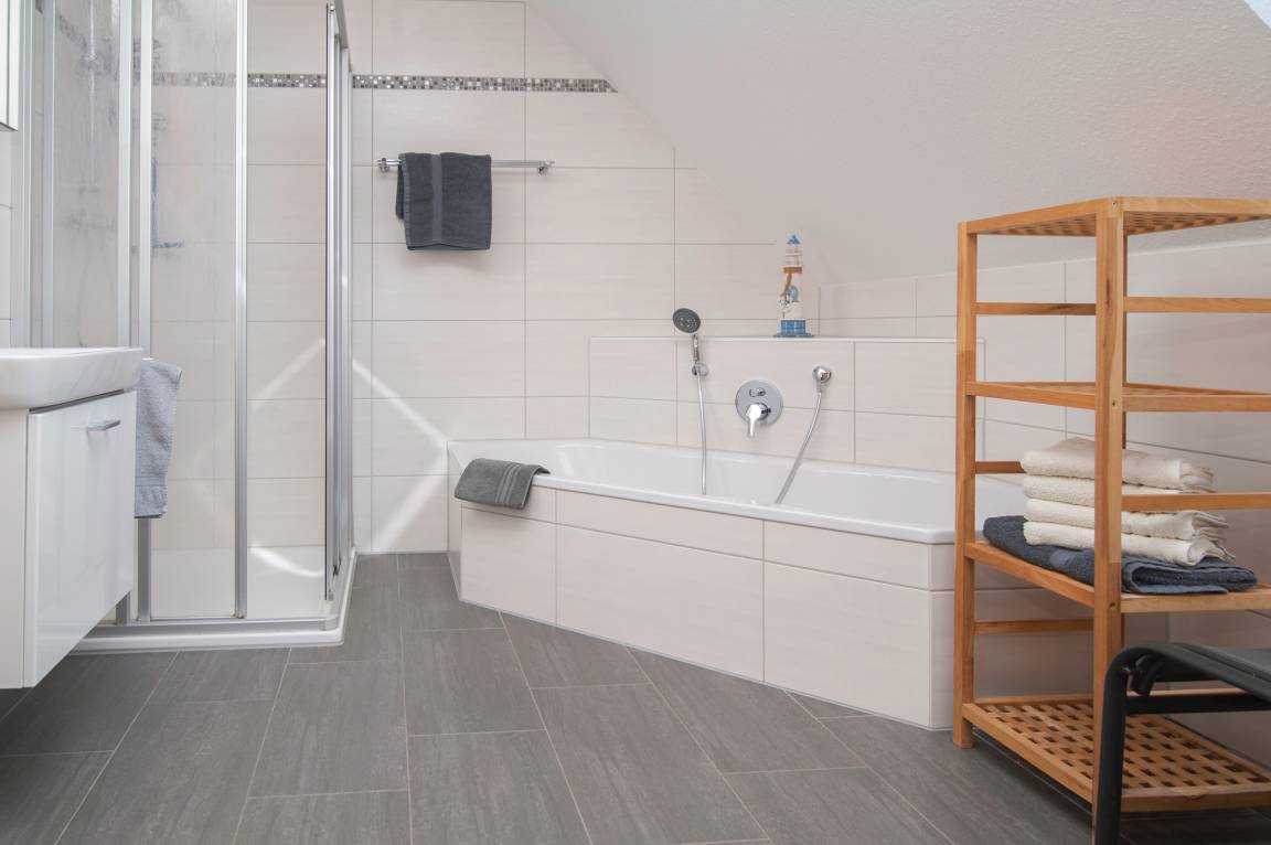 Das geräumige Badezimmer bietet eine Dusche mit niedrigem Einstieg, eine Badewanne, einen Föhn, ein WC und eine Sauna. Zudem befinden sich dort eine Waschmaschine (6 kg) und ein Kondenstrockner (7 kg).