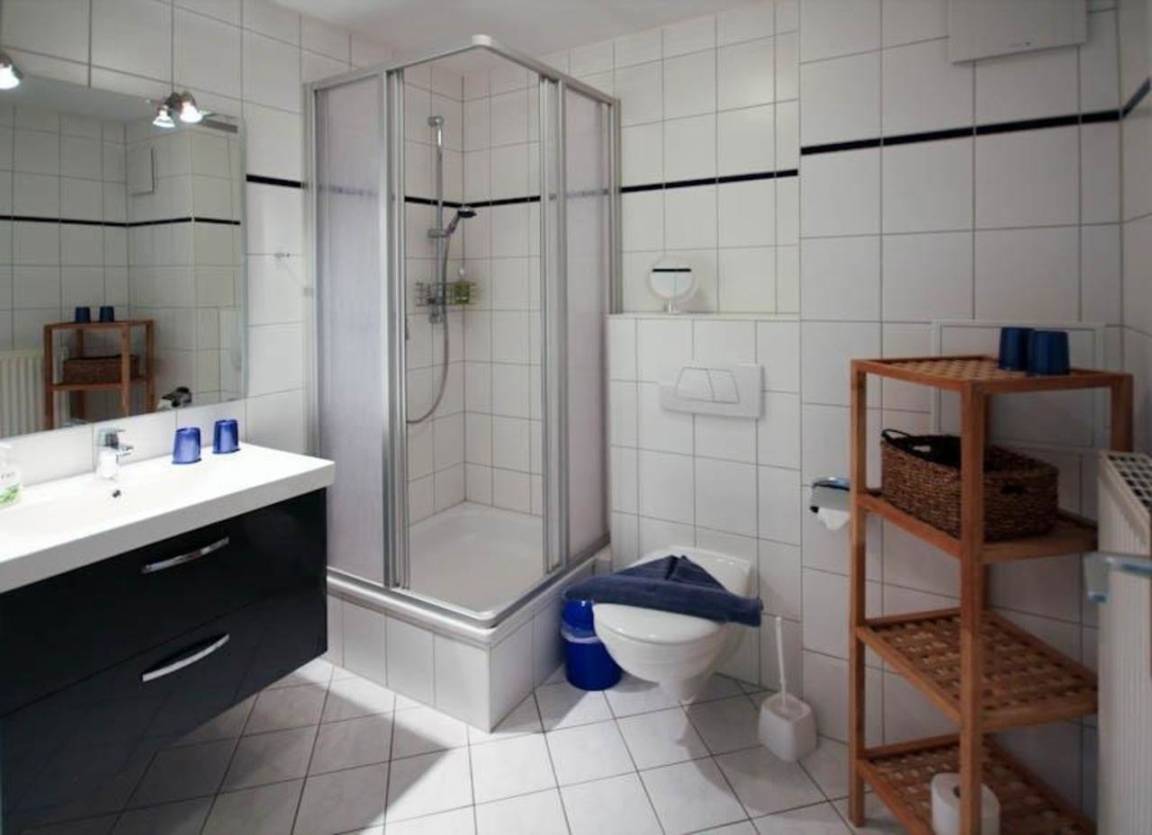 Das helle Badezimmer verfügt über eine Dusche, einen Waschtisch sowie ein WC. Für Ihre Badutensilien sind ausreichend Ablageflächen vorhanden. Auch ein Föhn steht Ihnen zur Verfügung.
