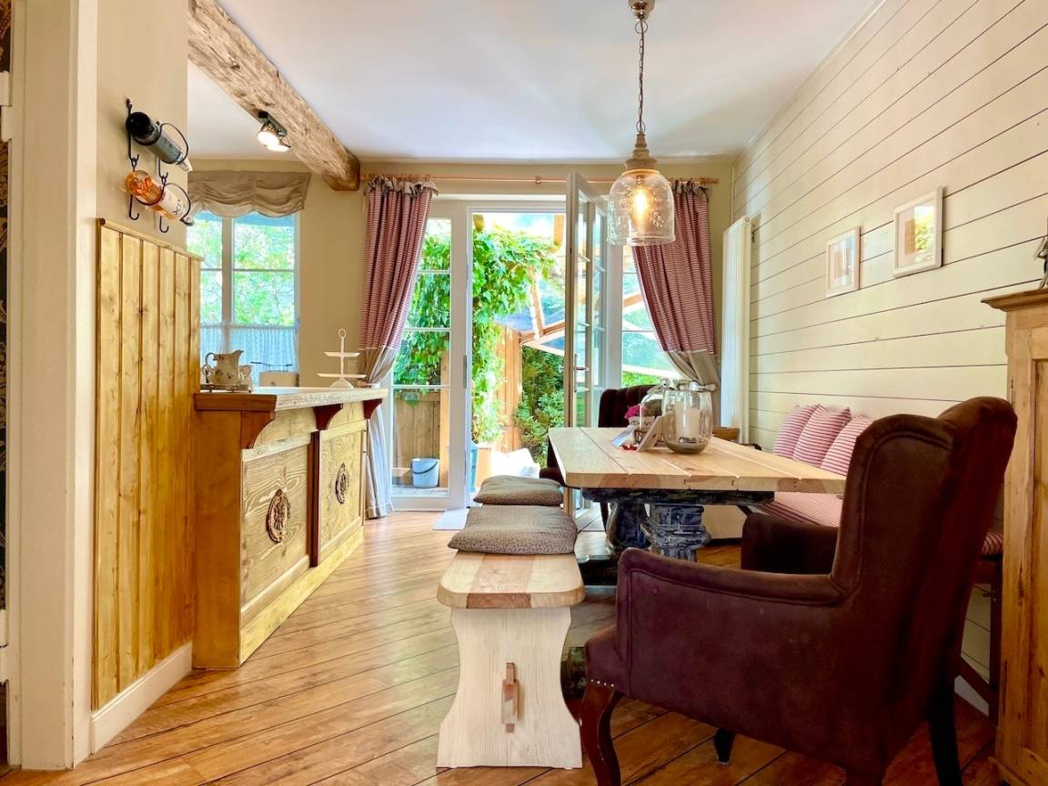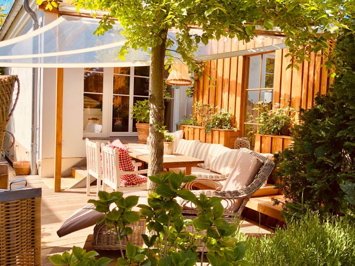 Gesamtgröße 90m², zuzüglich 17qm überdachter Südterrasse, kostenfreies WLAN, Kamin, 1 PKW Stellplatz, Nutzung des Garten SPA mit Schwimmteich, Gartensauna