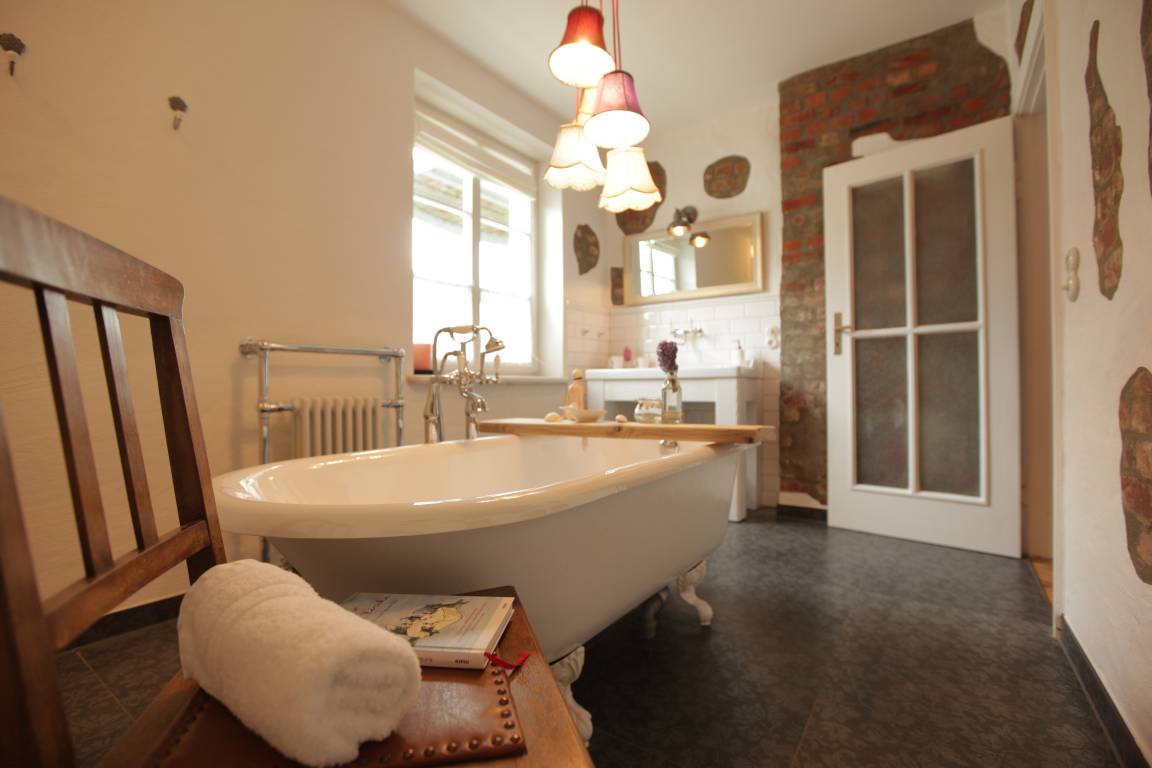 Das Badezimmer ist mit freistehender Badewanne, Dusche, WC und Fußbodenheizung ausgestattet.