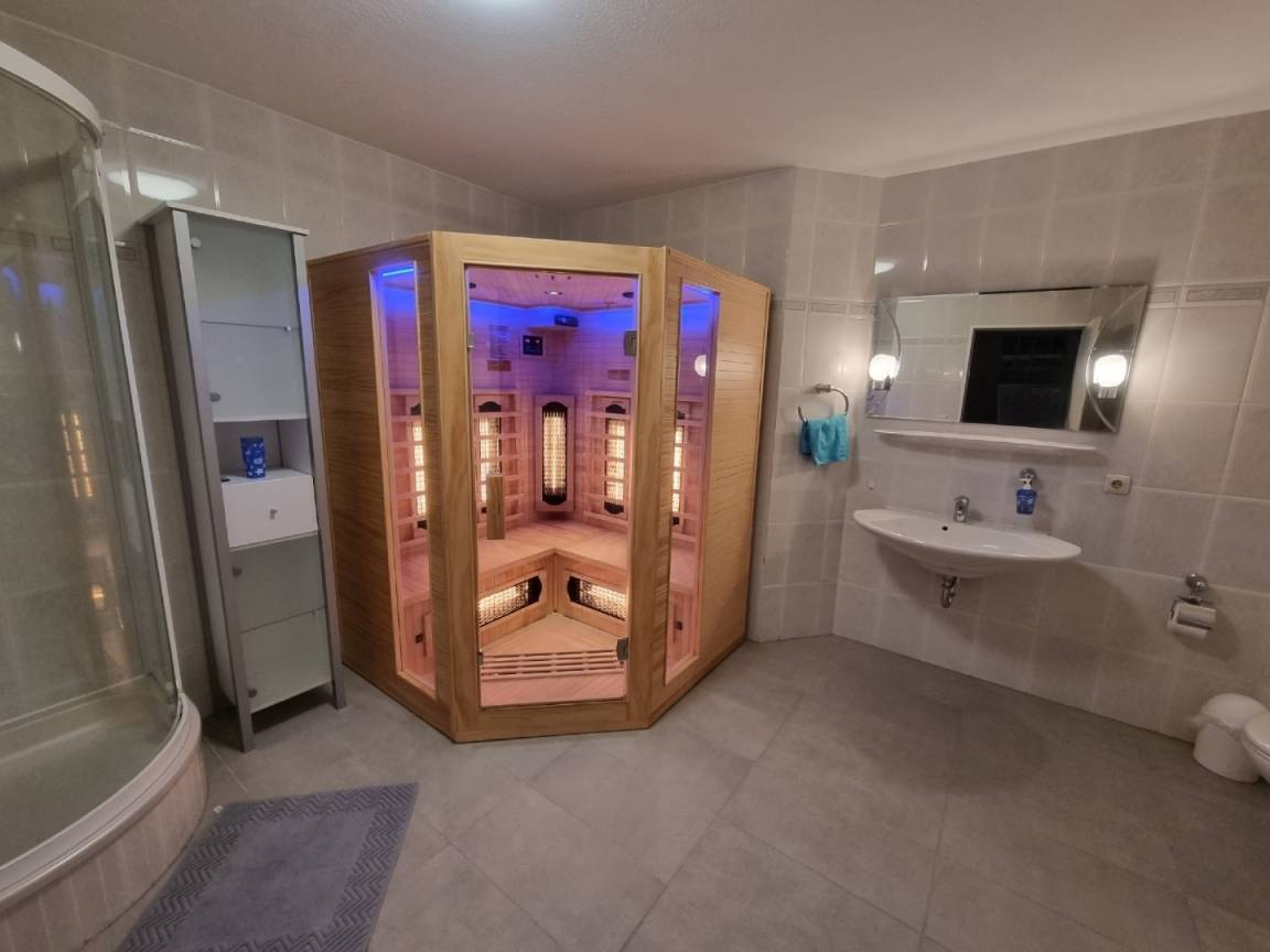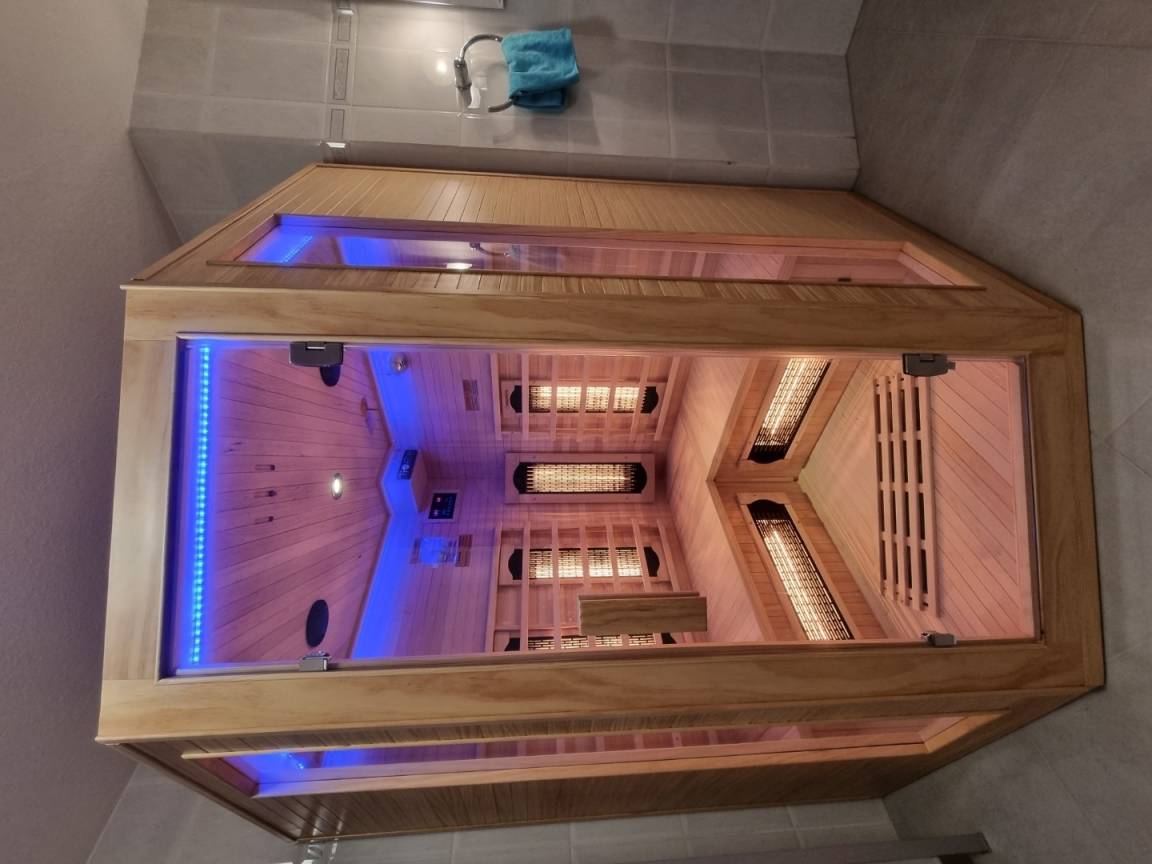 Ein helles, freundliches Wohnzimmer mit luxuriöser Barküche und Essplatz sowie einer Sofaecke und TV sind der zentrale Ort, von dem eine breite Wendeltreppe in ein großes Schlafzimmer und ein sehr großes Bad mit Dusche und einer Infrarotsauna hinab führt.