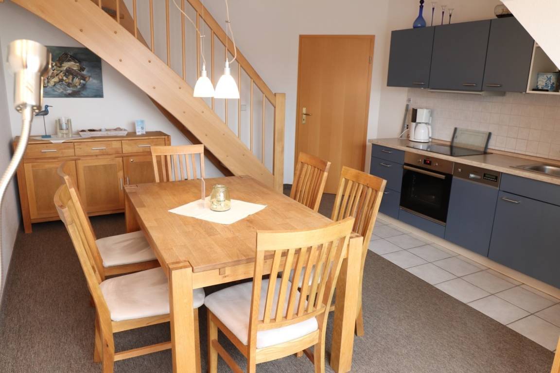Die Wohnküche ist mit einer großen Essgruppe und einer komplett eingerichteter Einbauküche ausgestattet.