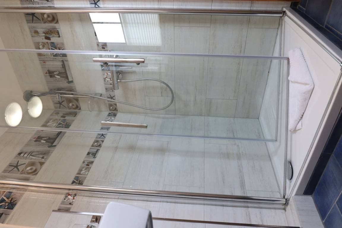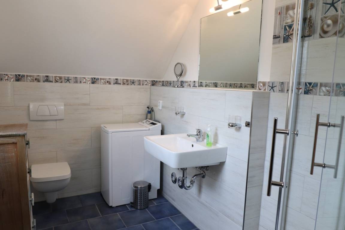 Das helle Tageslicht-Bad ist mit einer Dusche, einem WC und einer Waschmaschine ausgestattet.