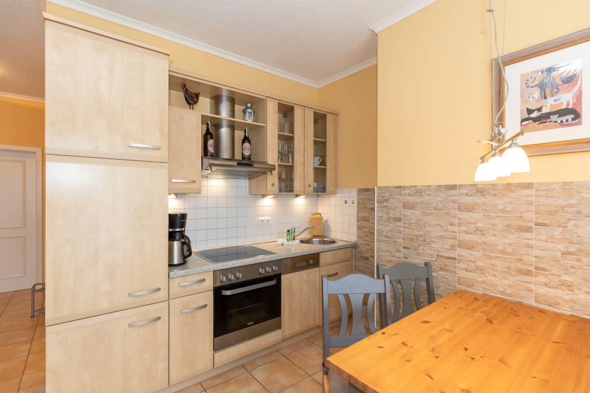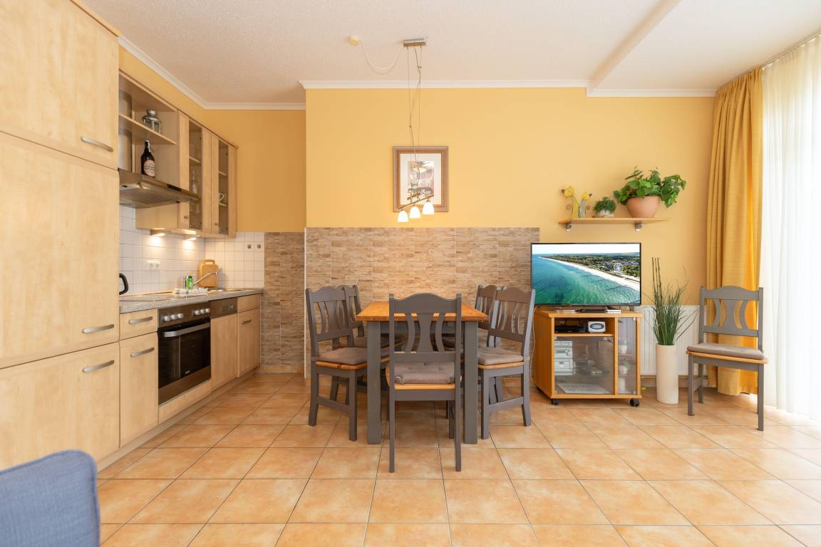Der Küchen-/Essbereich grenzt an das Wohnzimmer und bietet alles, was Sie für bis zu sechs Personen im Urlaub benötigen. Die Küche ist voll ausgestattet, sie bietet alle Bequemlichkeiten für die Zubereitung Ihrer Mahlzeiten.
