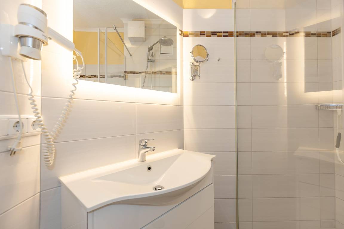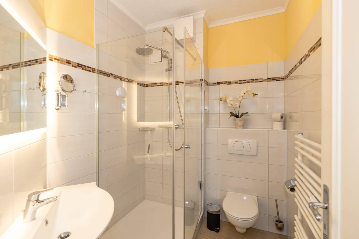Das Badezimmer verfügt über eine Dusche, ein WC und einen Handtuchheizkörper.