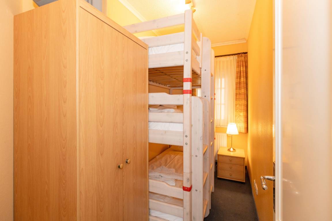 Das zweite Schlafzimmer ist mit einem Dreier-Etagenbett eingerichtet. Sowohl oben als auch unten können auch erwachsene Personen problemlos schlafen, die mittlere Liegefläche ist eher für Kinder gedacht. Auch hier finden Sie einen Kleiderschrank für Ihre Urlaubsgarderobe.