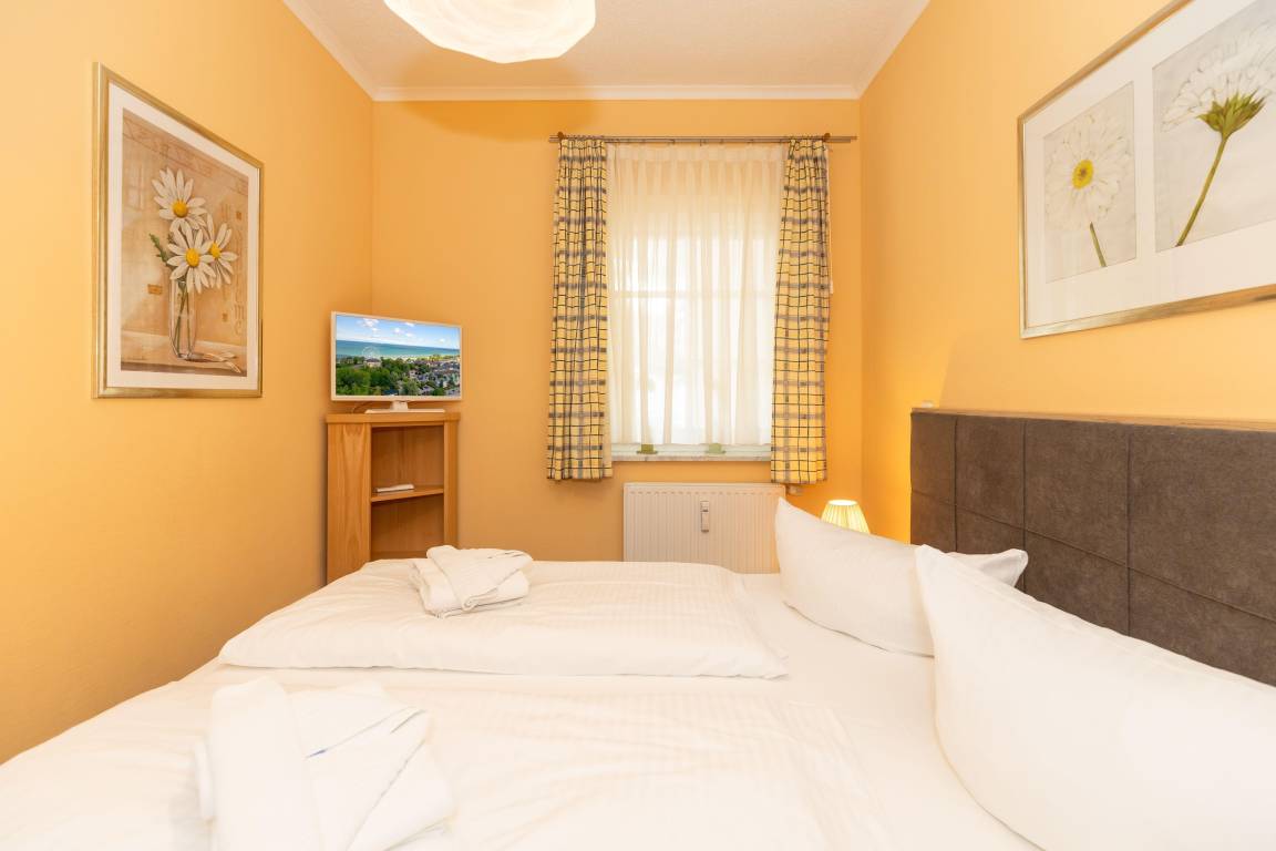 Im ersten Schlafzimmer finden Sie neben dem bequemen Doppelbett einen großen Einbaukleiderschrank. Ein Fernseher ist für das abendliche Fernsehen im Bett gut geeignet. Das in der Wohnung befindliche Babybett vom Typ Hauck findet hier bei Bedarf ebenfalls Platz.