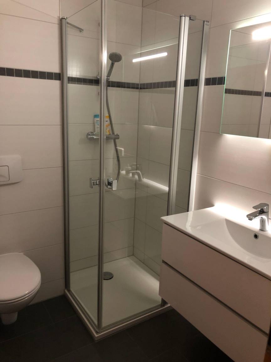 Das Badezimmer ist mit einer Dusche, einem geräumigen Waschtisch und WC ausgestattet.