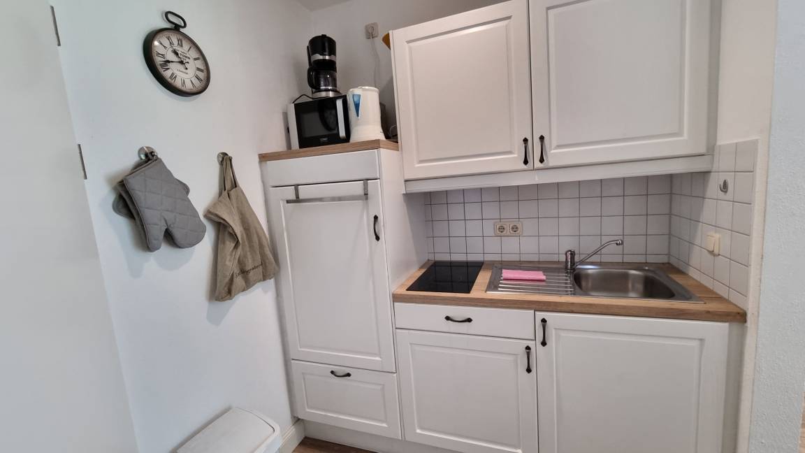Zur Küchenausstattung gehört ein Kühlschrank mit Gefrierfach, ein 2-Zonen Kochfeld, sowie Kaffeemaschine, Wasserkocher, Mikrowelle und ein Toaster.