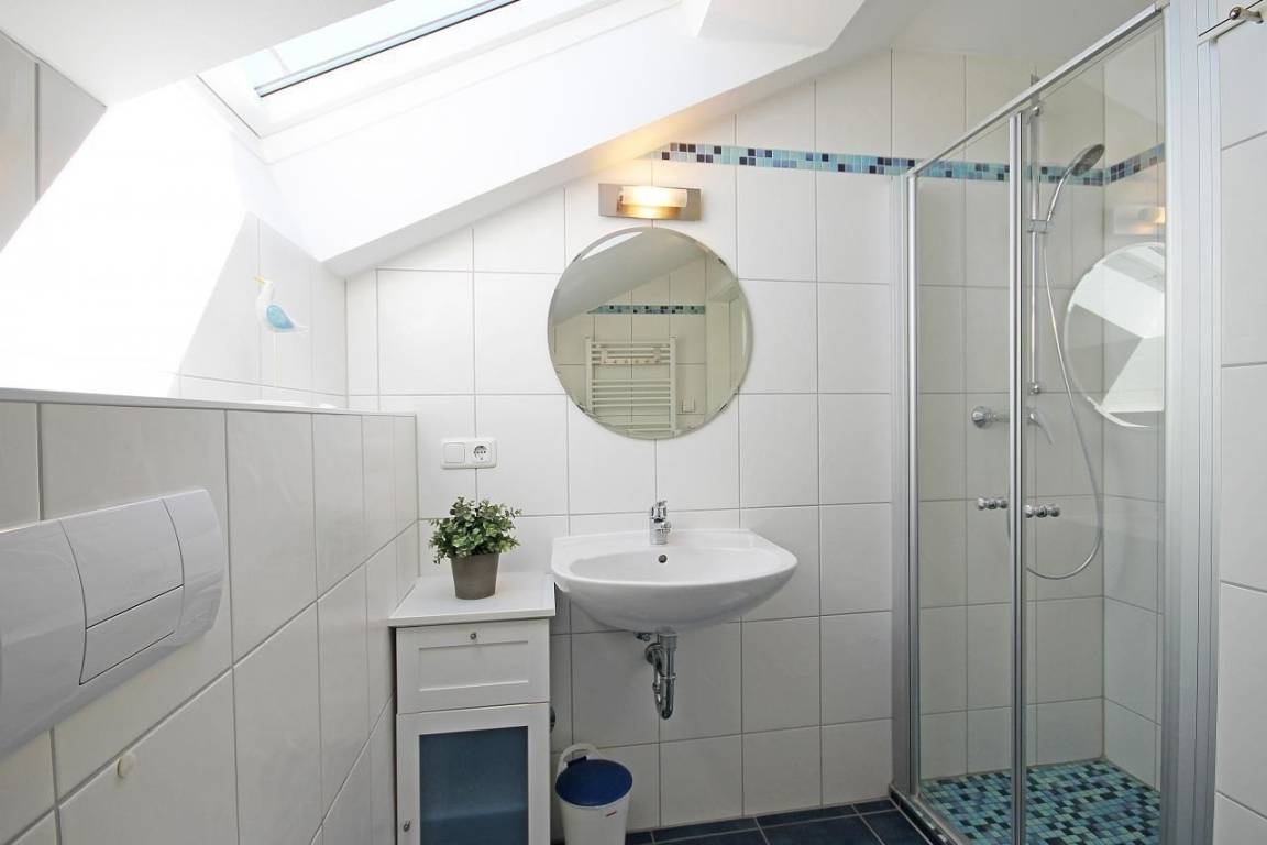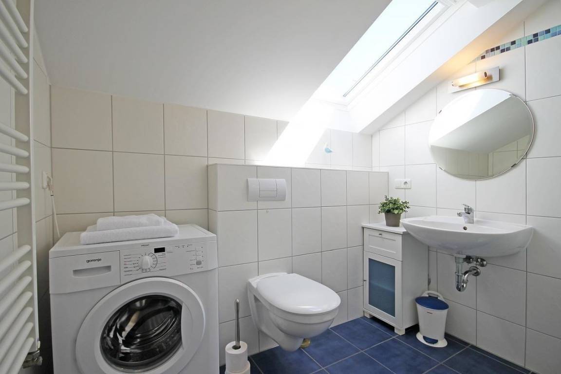 Das Badezimmer ist mit Fliesen ausgelegt und verfügt über eine ebenerdige Dusche, ein WC sowie ein Waschbecken. Genügend Ablagemöglichkeiten finden Sie im Badschrank. Gerne dürfen Sie auch die vorhandene Waschmaschine nutzen.