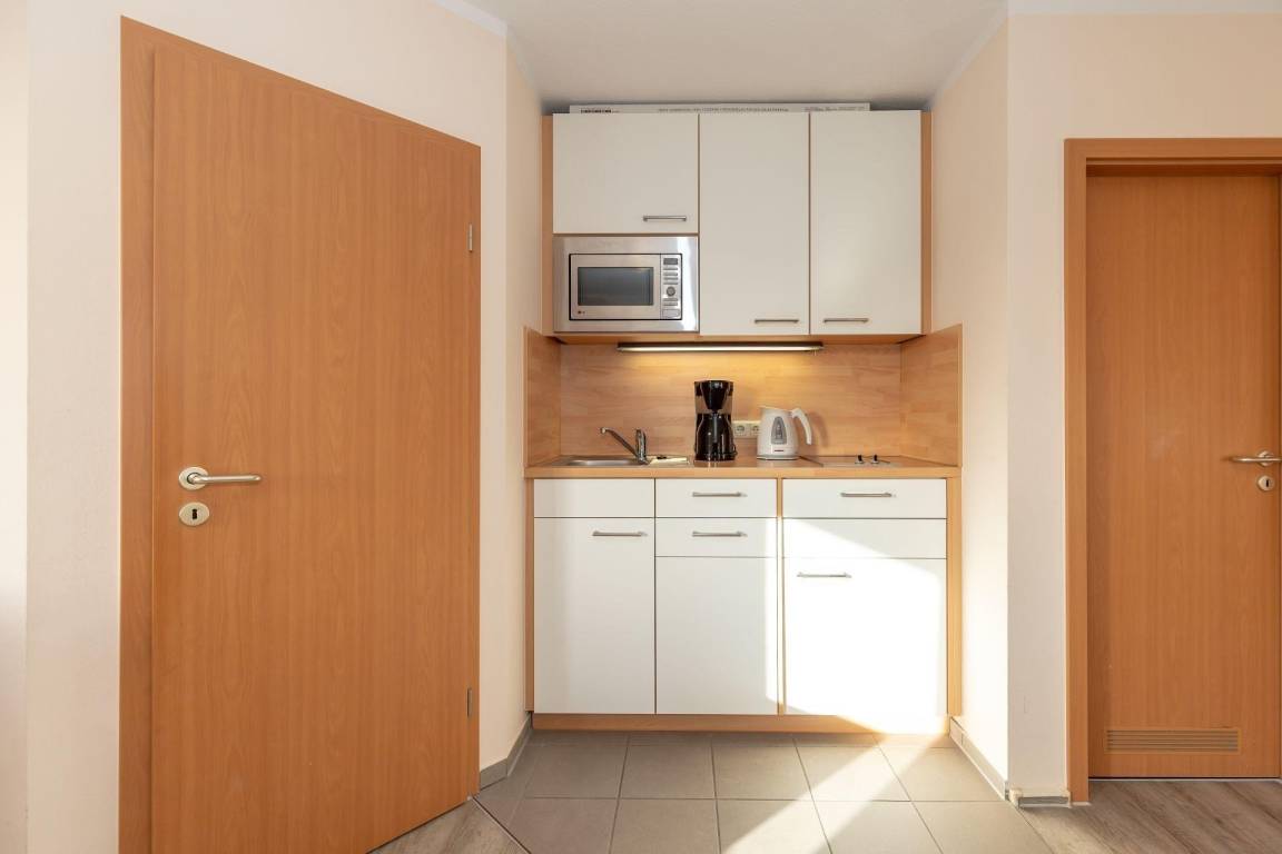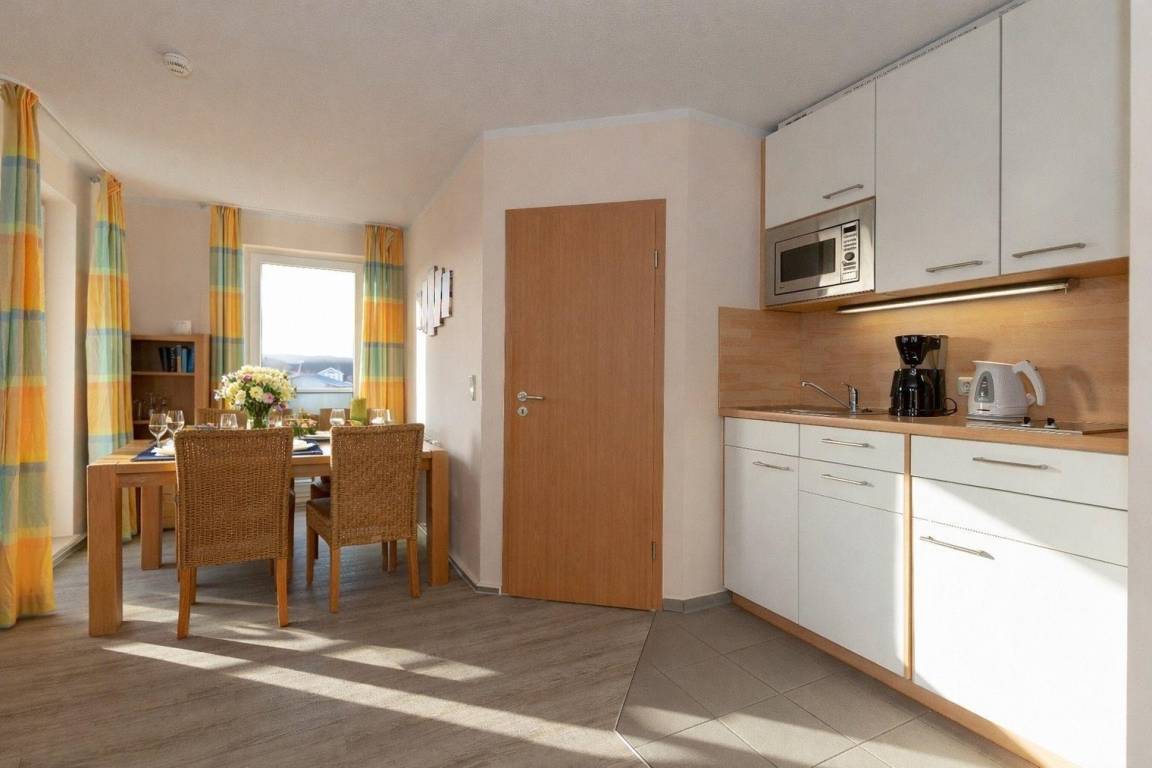 Im Anschluss an den Wohnbereich grenzt ein Esstisch mit 4 Stühlen für Ihre gemeinsamen Mahlzeiten. Diese können Sie in der kleinen, aber voll ausgestatteten Küchenzeile herrichten. Es stehen Ihnen alle Bequemlichkeiten einer modernen Küche zur Verfügung.