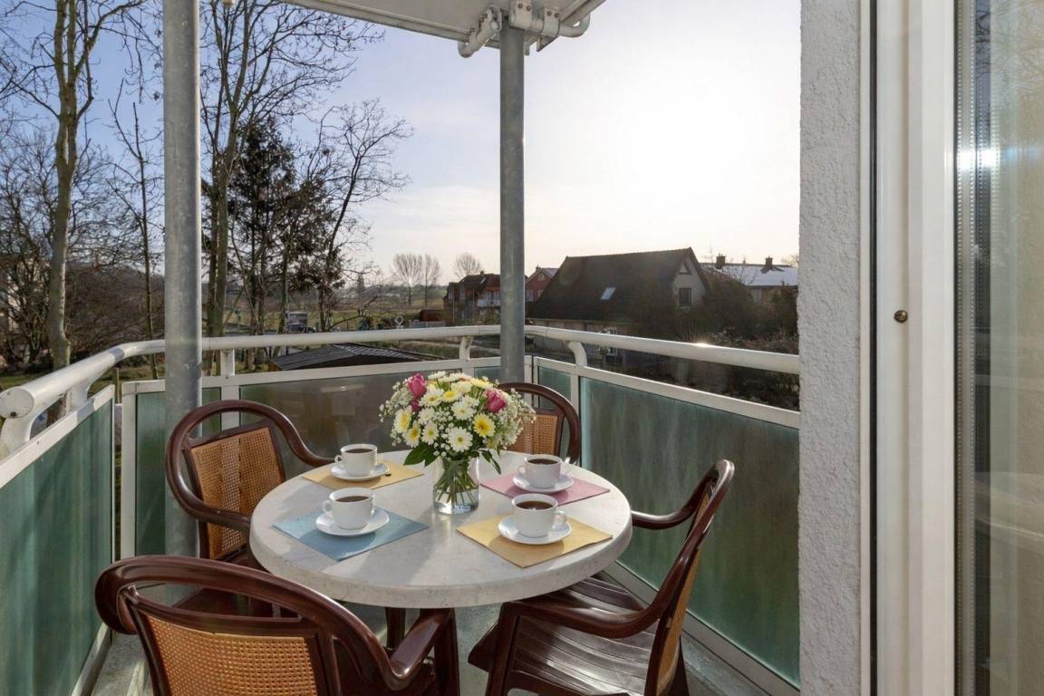 An Ihre Wohnung grenzt ein zur Südseite ausgerichteter Balkon, der mit modernen Balkonmöbeln ausgestattet ist. Hier können Sie gemütlich verweilen, die Sonne genießen und bei einem leckeren Getränk einen ereignisreichen Tag gemeinsam ausklingen lassen.