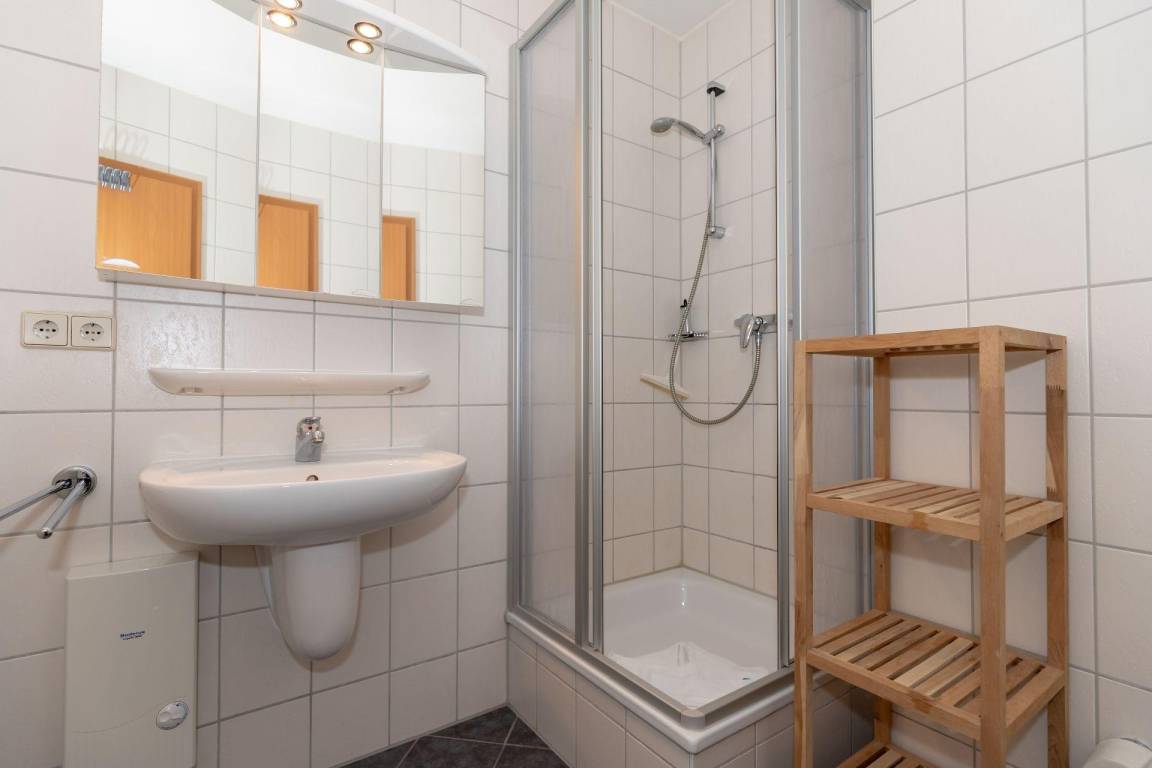 Das Badezimmer ist mit einer Dusche, einem Waschbecken und einem WC ausgestattet.