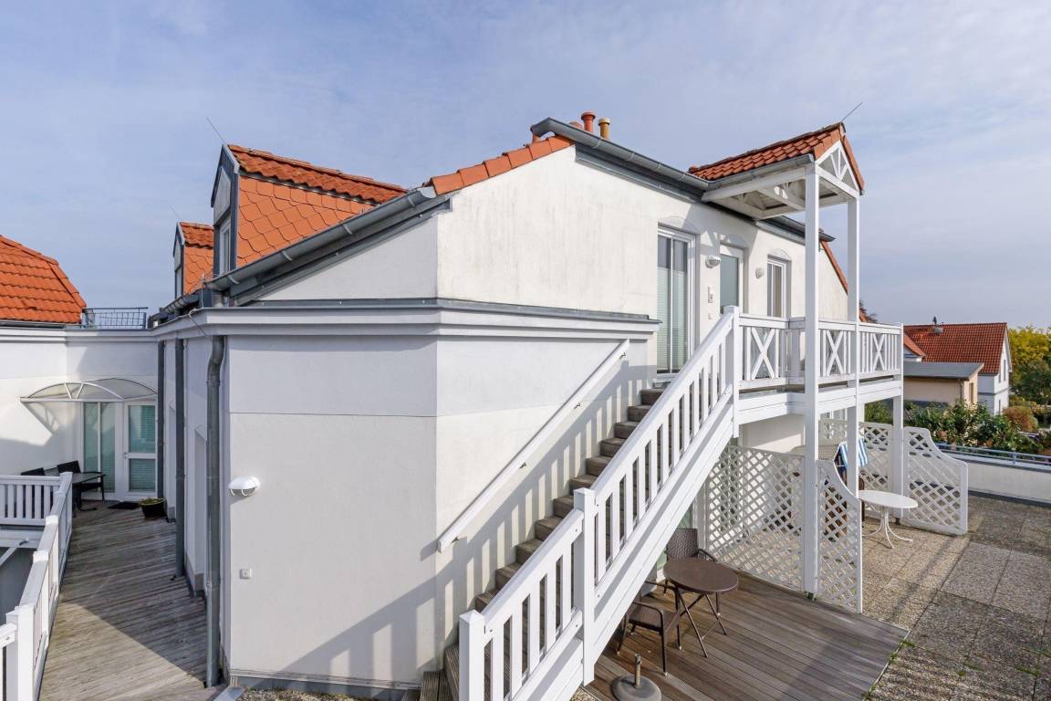Der Außenbereich der Wohnanlage "Am Stadtwald" ist parkähnlich angelegt. Sogar ein kleiner Teich befindet sich im Eingangsbereich. Über eine Außentreppe gelangen Sie schnell zu Ihrer Ferienwohnung.